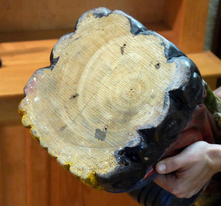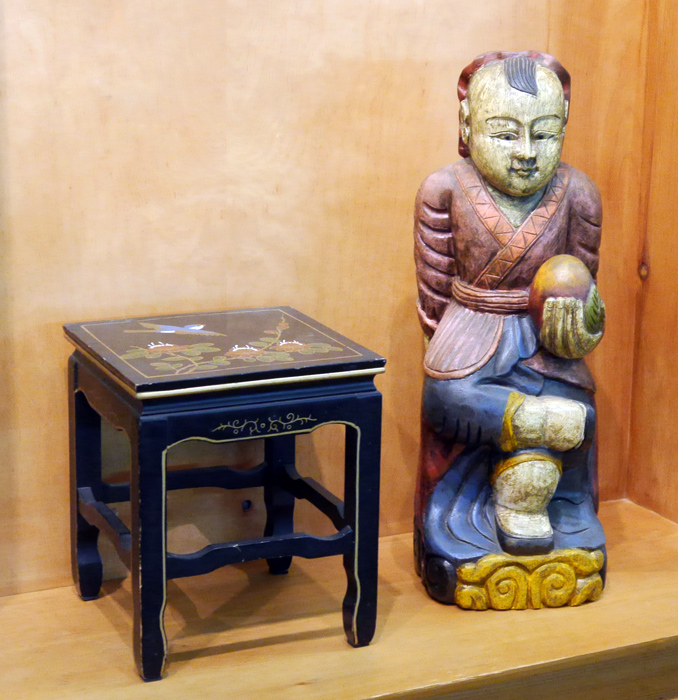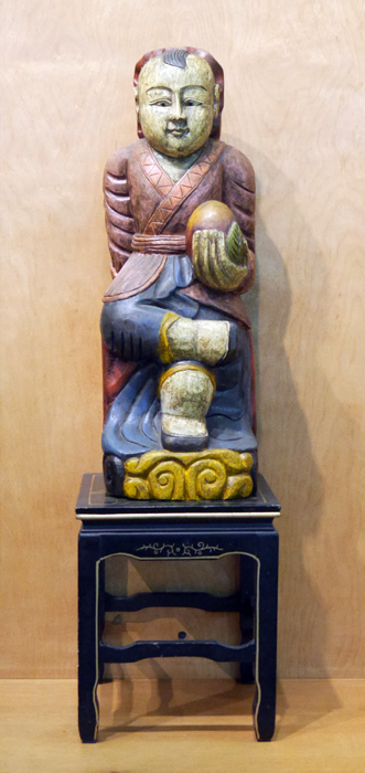 ORIENTAL POLYCHROME DECORATED CARVED MAN: Decorative figure of a paint decorated seated man holding a peach in hand, no visible signature. Measures 25'' h. x 8 3/4'' x 9''. Sold with small table stand, 13''h. x 11'' x 11''.
