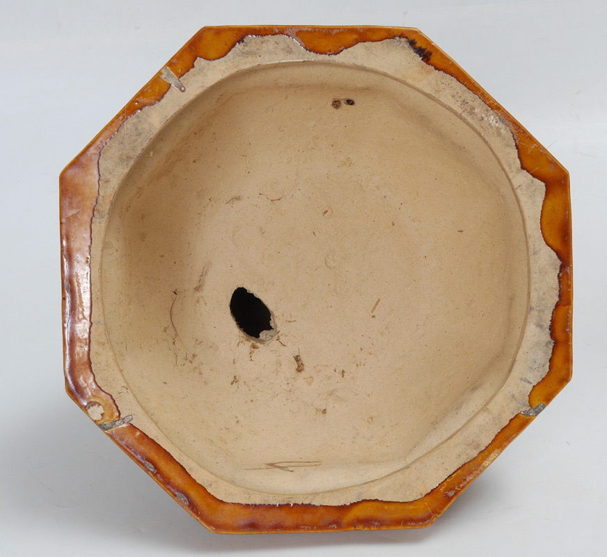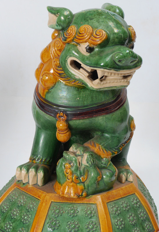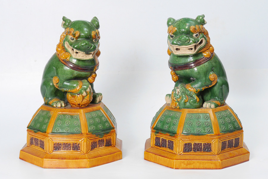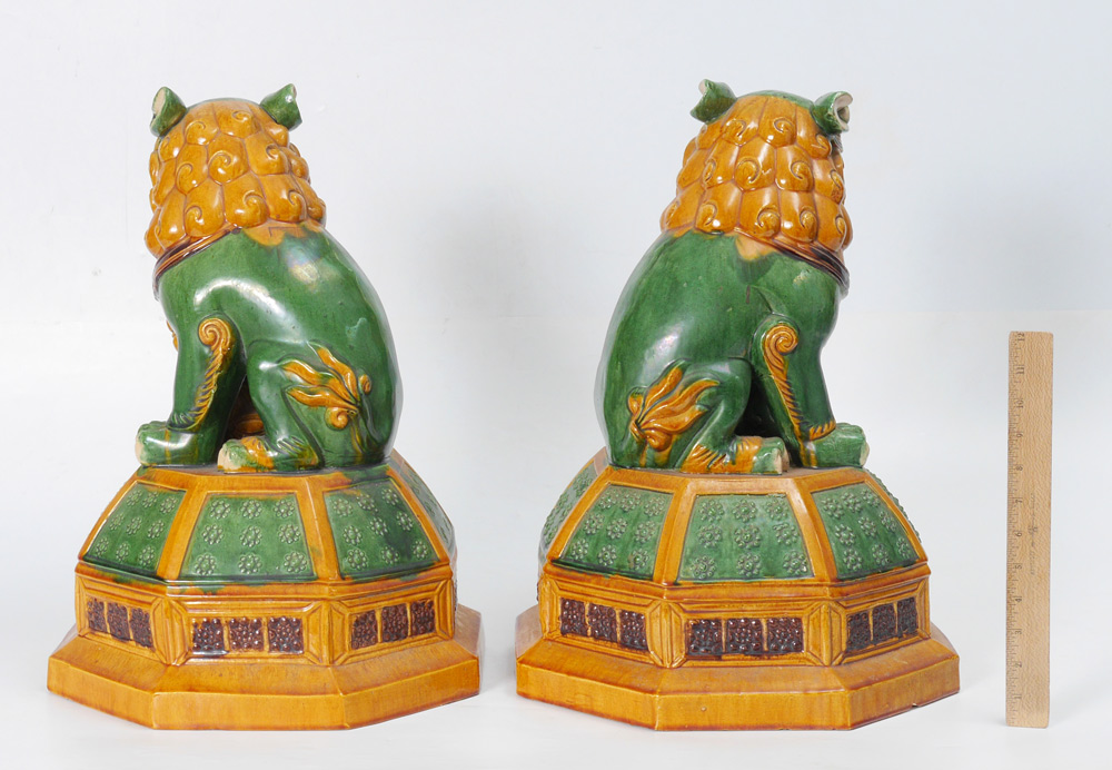 PAIR CHINESE EARTHENWARE FOO LIONS: Green, yellow and brown glaze, each affixed to octagonal base. 19 1/2'' h. x 14''.