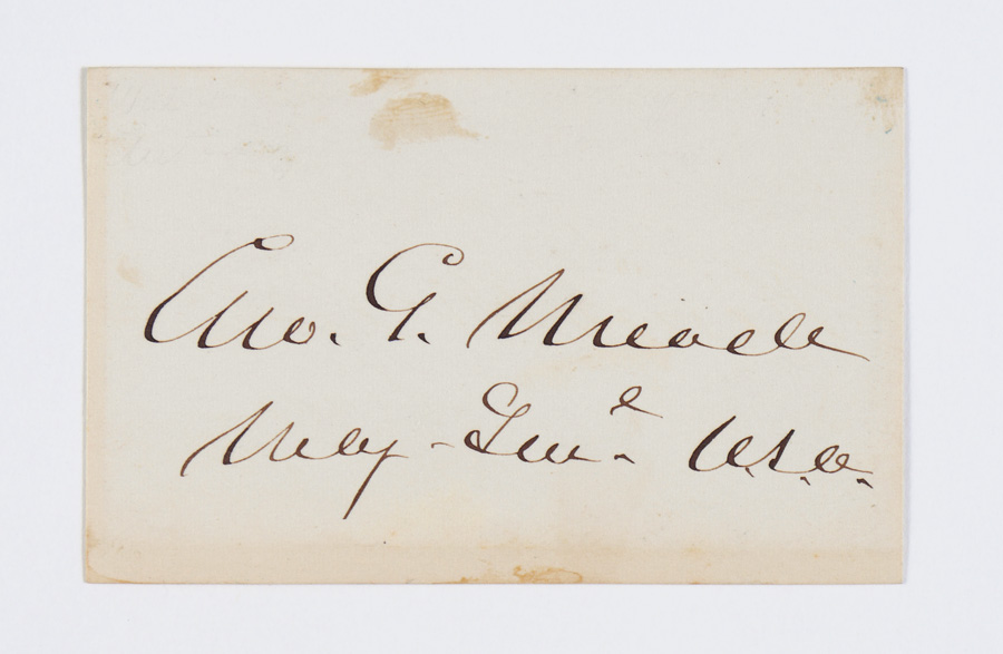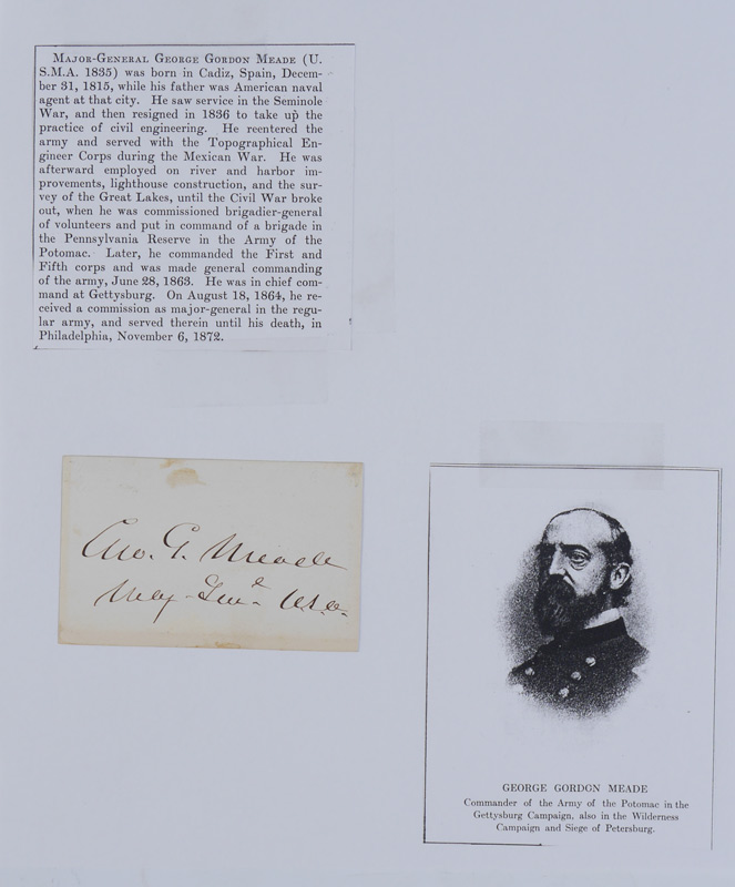 GENERAL GEORGE GORDON MEADE CLIP AUTOGRAPH: Signed in pen on card, Civil War General Meade was the Chief Commander at Gettysburg. Card measures 2 1/2'' x 3 1/4''.