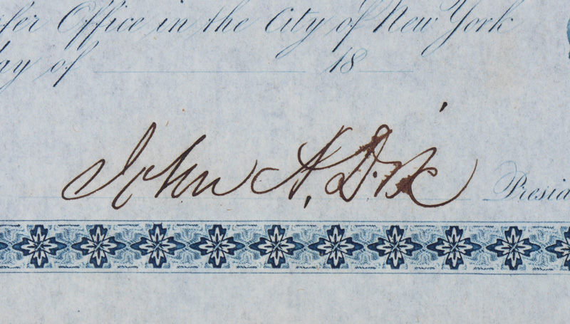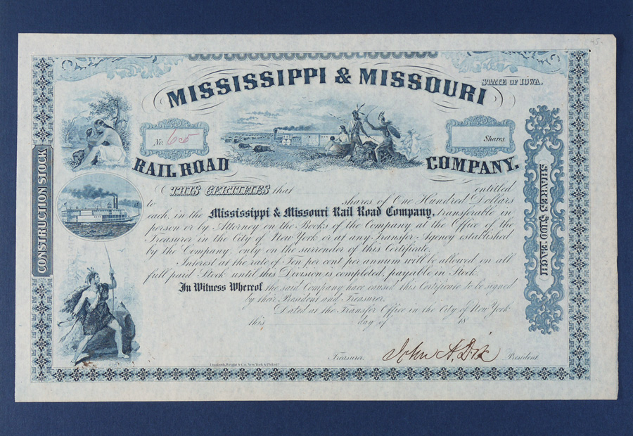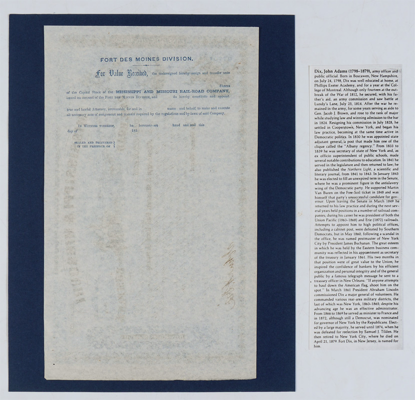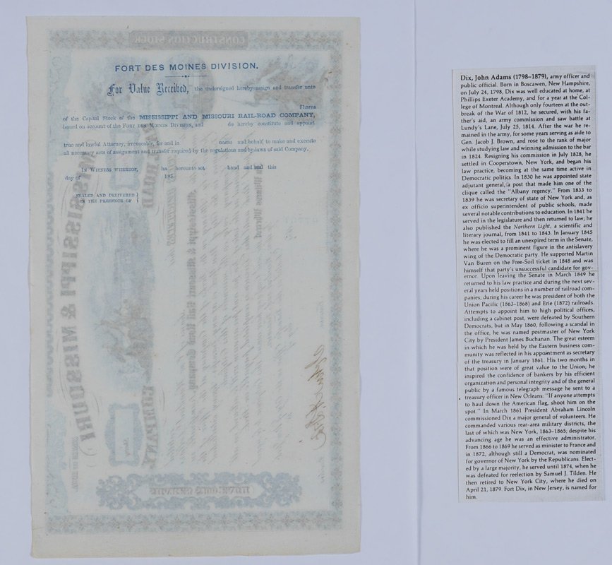 GENERAL JOHN A DIX SIGNED STOCK CERTIFICATE: Undated stock certificate for the Mississippi and Missouri Railroad Company, never issued, signed bottom right. 6 1/4'' x 10 1/4''.