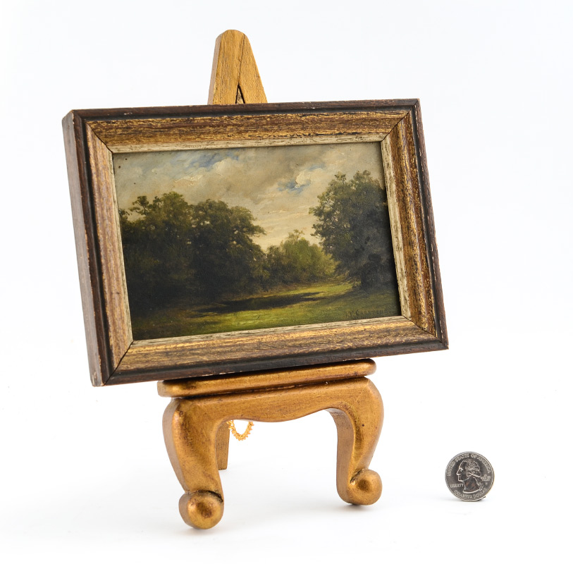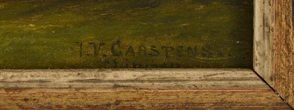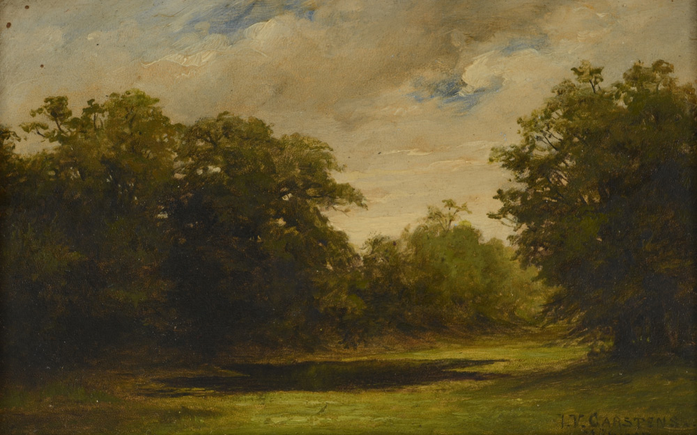 CARSTENS, Julius Victor, (German 1849-1908): Serene wooded landscape with pond, Oil/Panel, signed lower right J. V. Carstens, Munichen. Diminutive in size, 3 5/8'' x 6 1/8'', 4 3/4'' x 6 3/4'' w / frame. Carstens often exhibited at the Munich Glass Palace and at the Berlin Art Exhibitions.