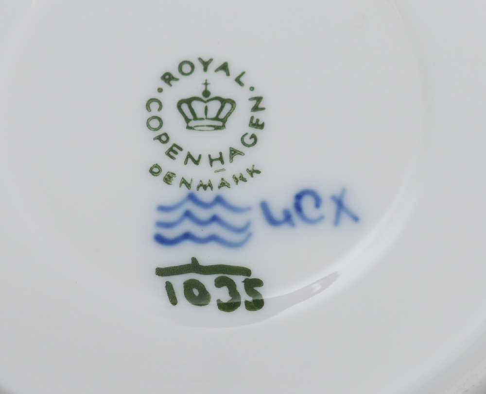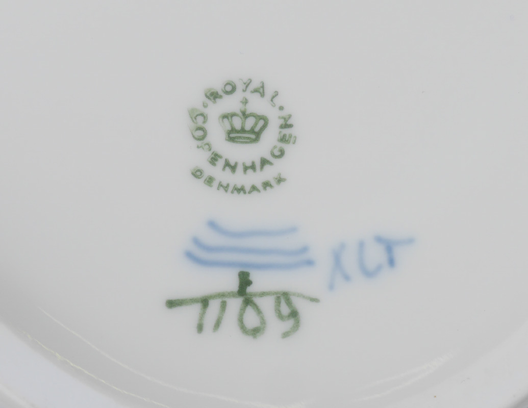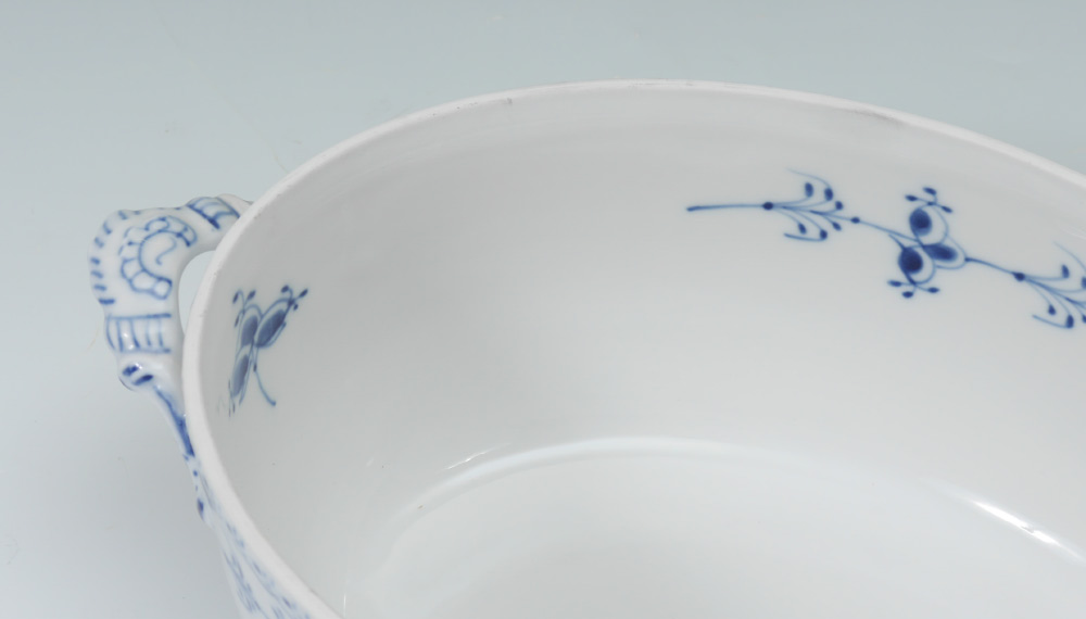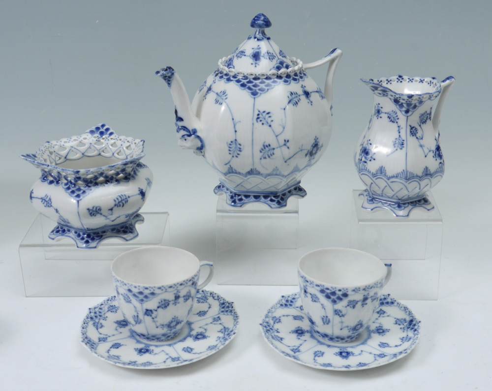 ROYAL COPENHAGEN BLUE FLUTED FULL LACE CHINA: 12 pieces to include the oval tureen 1109, and lid (11 1/2'' x 8''), teapot (7''), cream pitcher (5''), open sugar (3''), and 4 cups and saucers.