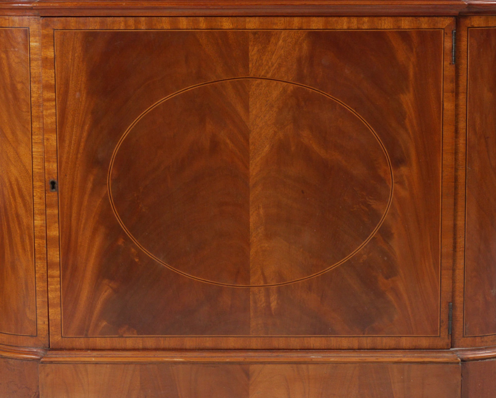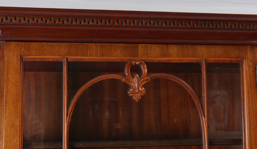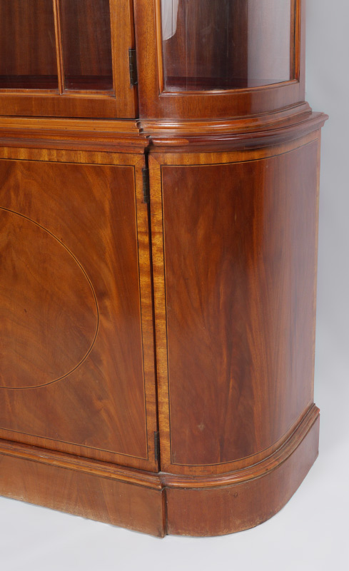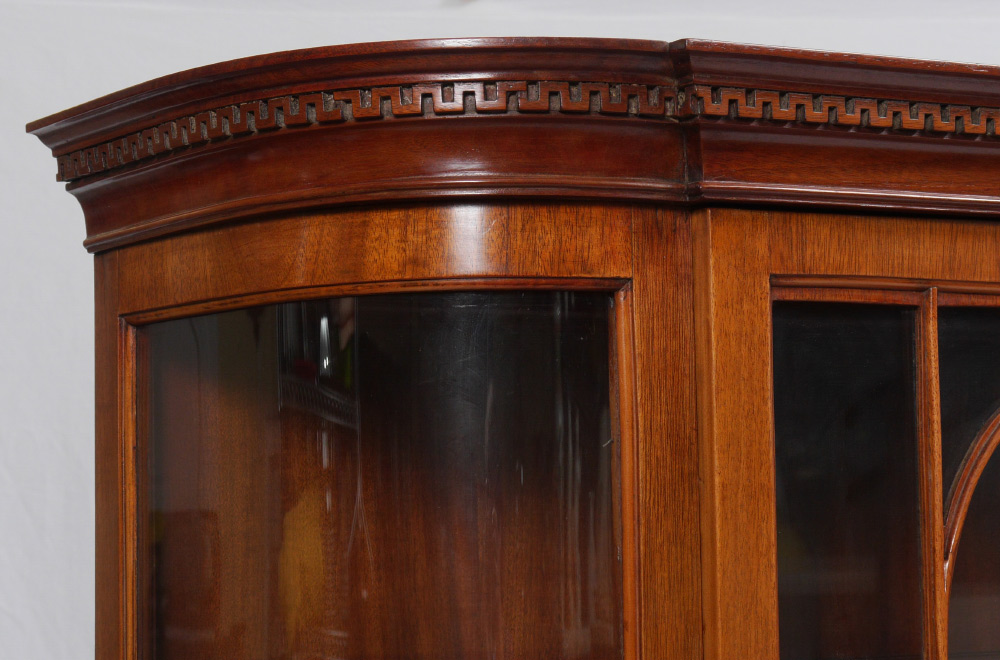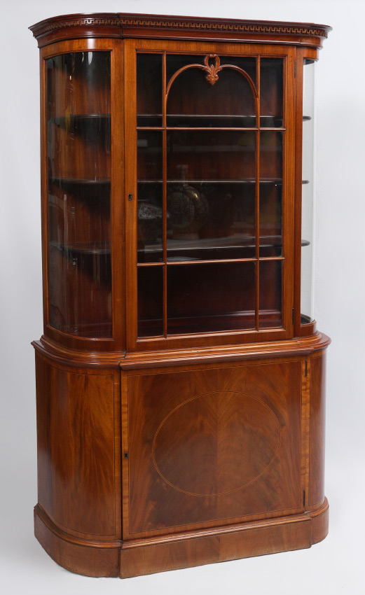 RICHLY GRAINED MAHOGANY CHINA CABINET: Greek key molding over glass door with fretwork, bowed glass sides, 3 wood shelves with plate rails. Base with single door with string inlay, bowed sides. Overall measures 69 1/4'' h. x 41 1/2'' x 14 1/4''.