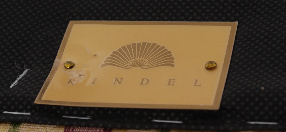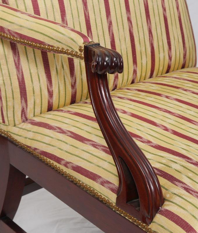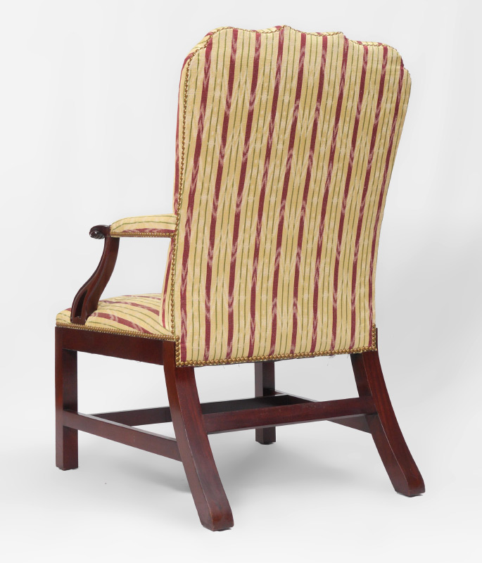 KINDEL CHIPPENDALE STYLE TRADITIONAL LOUNGE CHAIR: Tacked striped patterned upholstery, carved hand holds and supports, Kindel tag under seat. 42 3/4'' h. x 30 3/4'' x 27''.