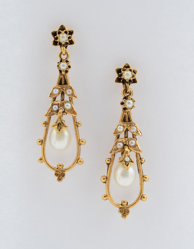 14K PEARL DROP EARRINGS: 14K yellow gold antique style earrings with seed pearls and drop shaped pearls. Post and nut closures. Approx. 1.5'' long. Weight: 5.7 grams.