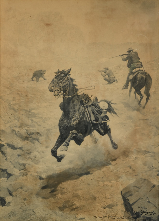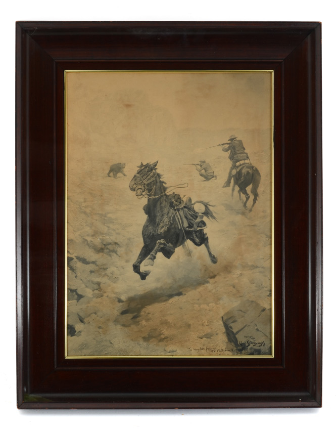 SCHREYVOGEL, Charles, (American, 1861-1912): ''An Unexpected Enemy'', Platinum Print, sight size 19'' x 14'', signed in pen lower right and dedicated ''To my good friend, Dr. William Fisher'', framed under glass, 26 1/2'' x 21''. Good Provenance, direct correlation with well known Shreyvogel patron, Dr William Redwood Fisher, a Hoboken physician.