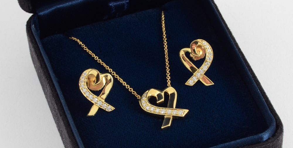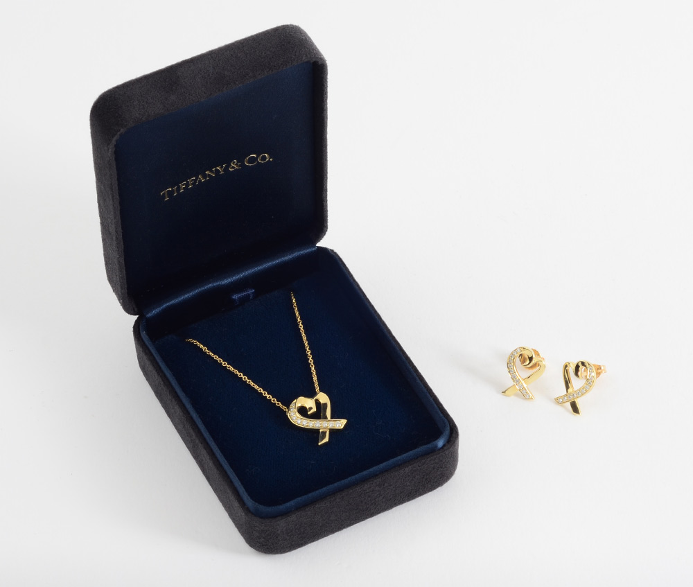 PALOMA PICASSO TIFFANY & CO. EARRINGS & NECKLACE SUITE: Loving Hearts Collection. 18K yellow gold with .40 Ct diamonds, VVS clarity and F color. The chain is 16'', the hearts are .5''. Weight approx. 6.5 grams. Profusely signed. Sold with the Tiffany & Co. box.
