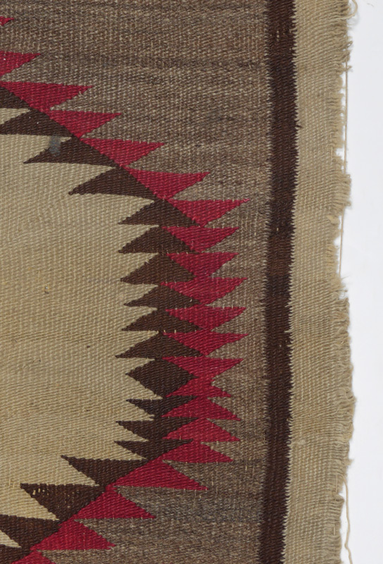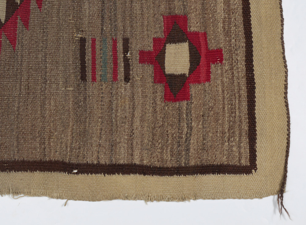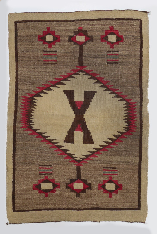 SEMI-ANTIQUE NAVAJO RUG, 3'6'' x 5': This rug has a good bold design consisting of a large white central medallion with red and dark brown saw tooth edging and a red and brown X in the center. On either end are suspended small stepped star motifs with matching motifs on either side. Above these outer stars are small gatherings of stripes of brown, red, and blue. All of this rests on a grey-beige, brown, and white mottled natural colored wool ground. This field is bordered by a single band of brown and a white outer border.