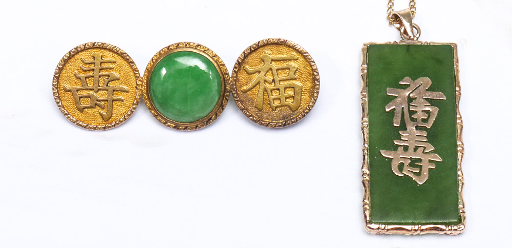 2 PIECE JADE JEWELRY: 1) 18k yellow gold bar pin with a jadeite jade disc at the center, 1.5'' length. 4.5 grams. 2) Vermeil mounted nephrite jade pendant on an 18th gold filled chain.