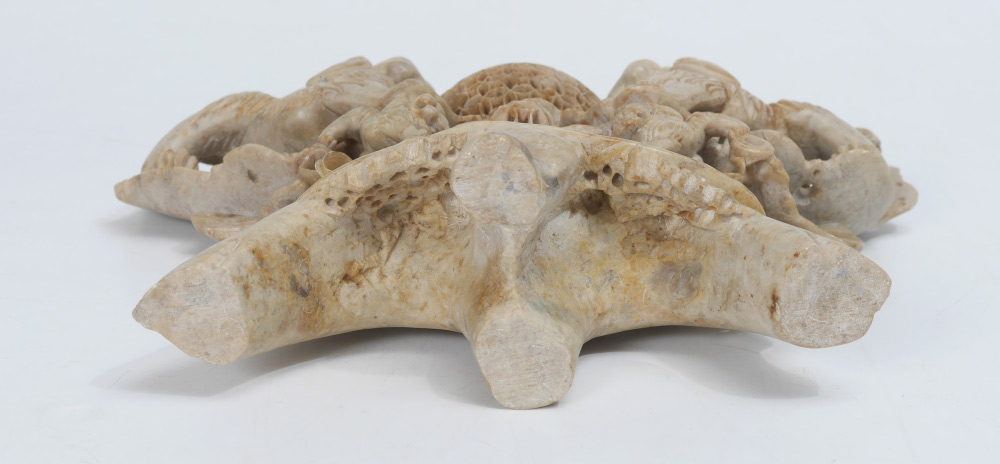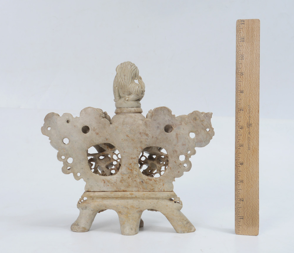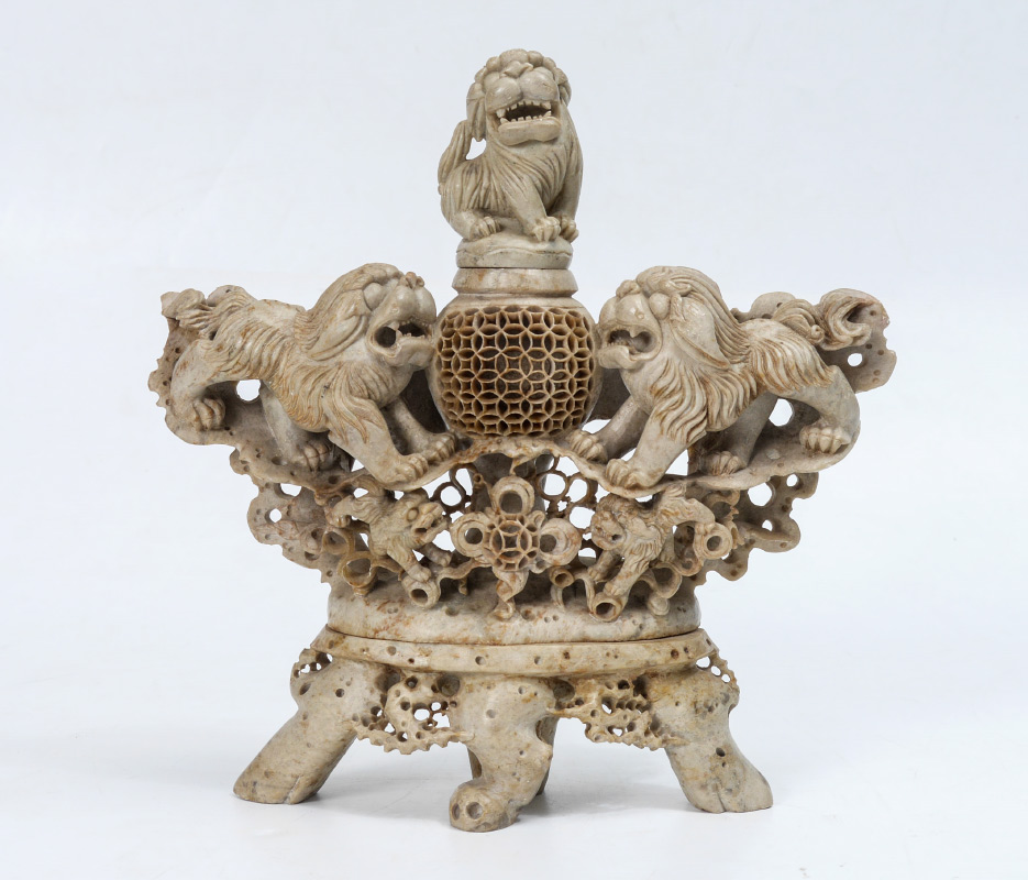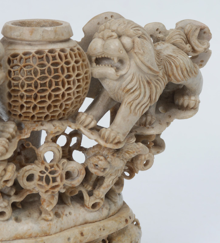 CHINESE CARVED SOAPSTONE FOO DOG CENSOR: The sculpture with seated Foo lion on the lid surmounting the rounded reticulated jar having full bodied Foo dog handles. Playful Foo dog pups can be seen on the bottom section rising on a splay legged base of four legs and carved brackets. 9 5/8''h