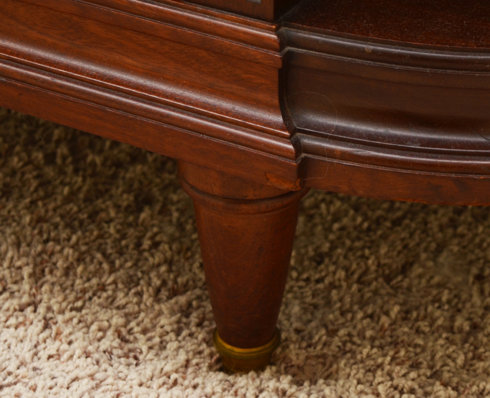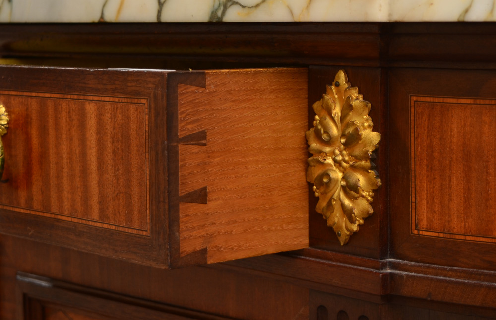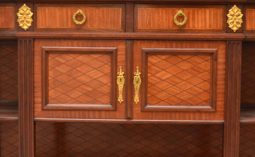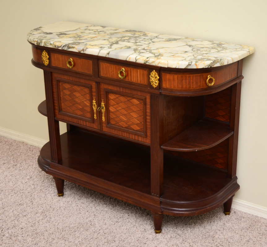 ONYX TOP REGENCY STYLE SIDE BOARD: Shaped onyx top over 2 drawers over 2 doors with parquetry inlay, open storage shelves, open lower shelf, turned legs. Overall measures 40'' h. x 52'' x 19 1/2''.