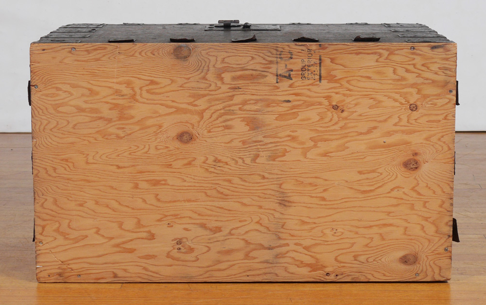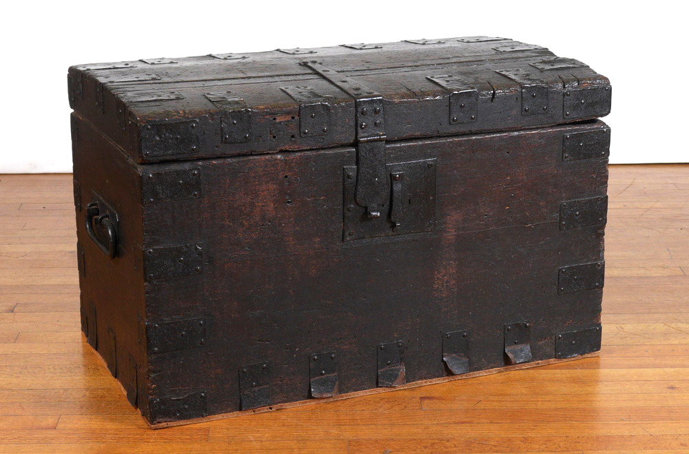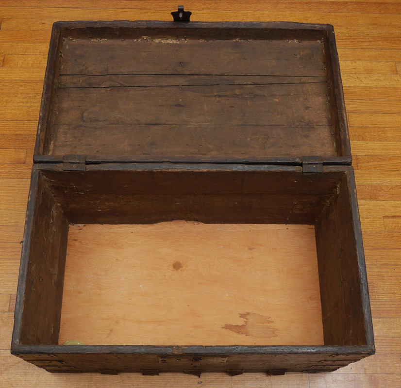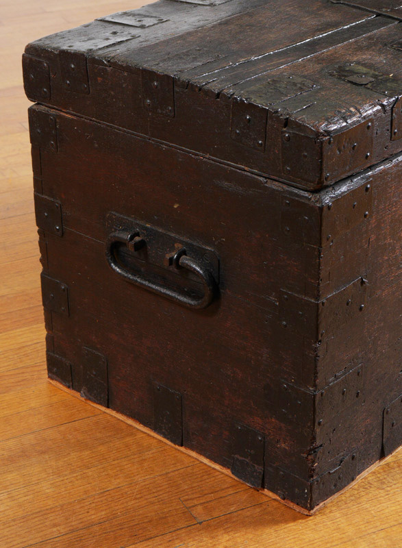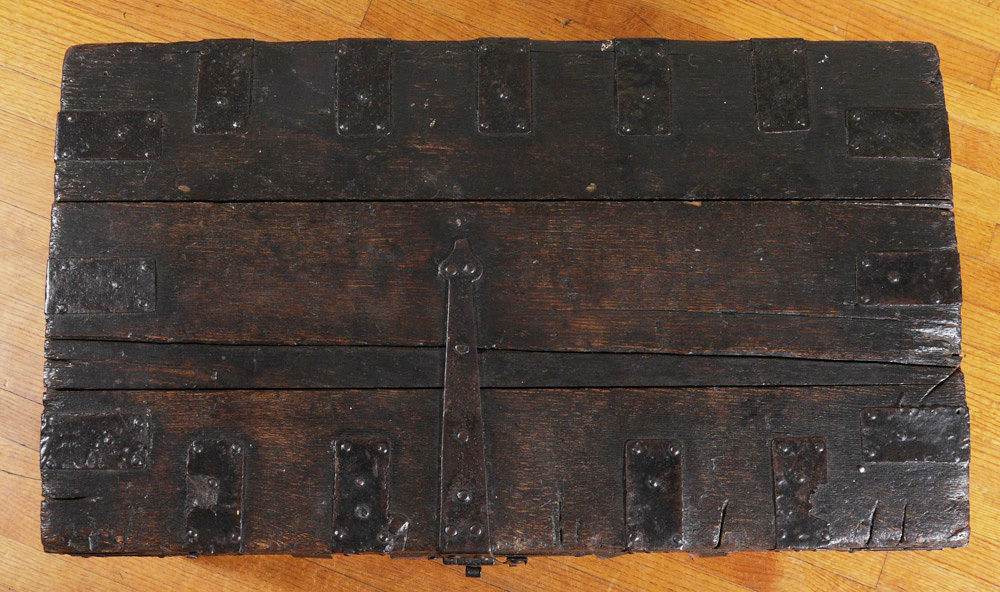 EARLY CONTINENTAL OAK CHEST WITH IRON HARDWARE: Slightly domed top with iron straps, handles and lock hardware. Overall measures 21 1/4'' h. x 34 3/4'' x 20 1/2''