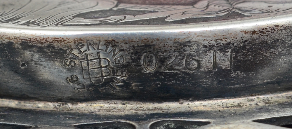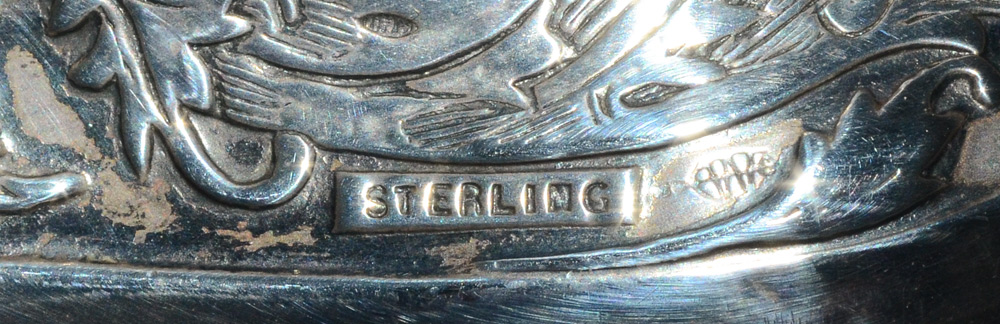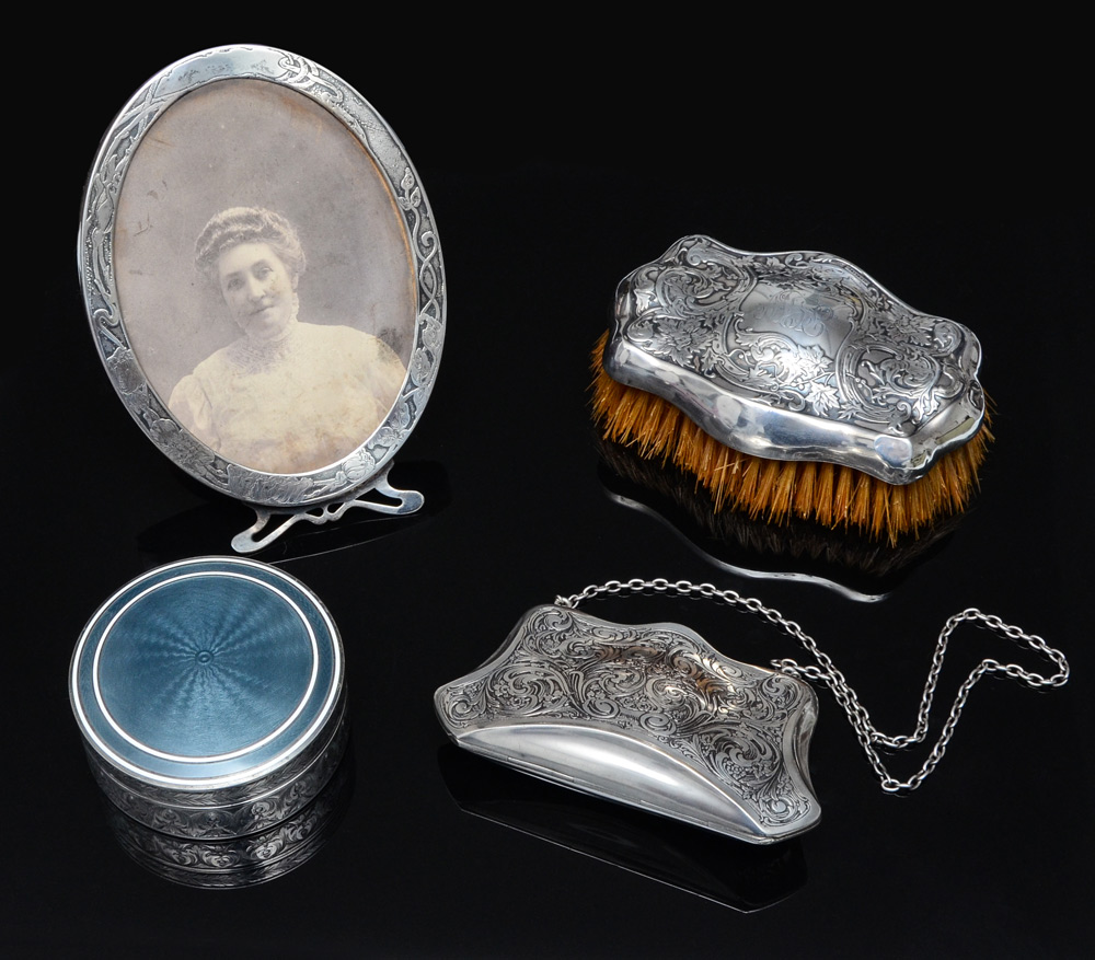 COLLECTION OF SILVER OBJETS DE VERTU: 4 pieces total to include 1) Unger Brothers sterling easel back picture frame, 6'' x 4 1/4''. 2) William B. Kerr engraved sterling purse, monogrammed, 2 1/2'' x 4 1/2'' x1 1/8''. 3) Webster hand brush, embossed foliate design, monogrammed, 4 1/2'' x 3'' x 2''. 4) William Kerr sterling powder box with guilloche lid, engraved sides. 3'' dia x 1 1/2''.