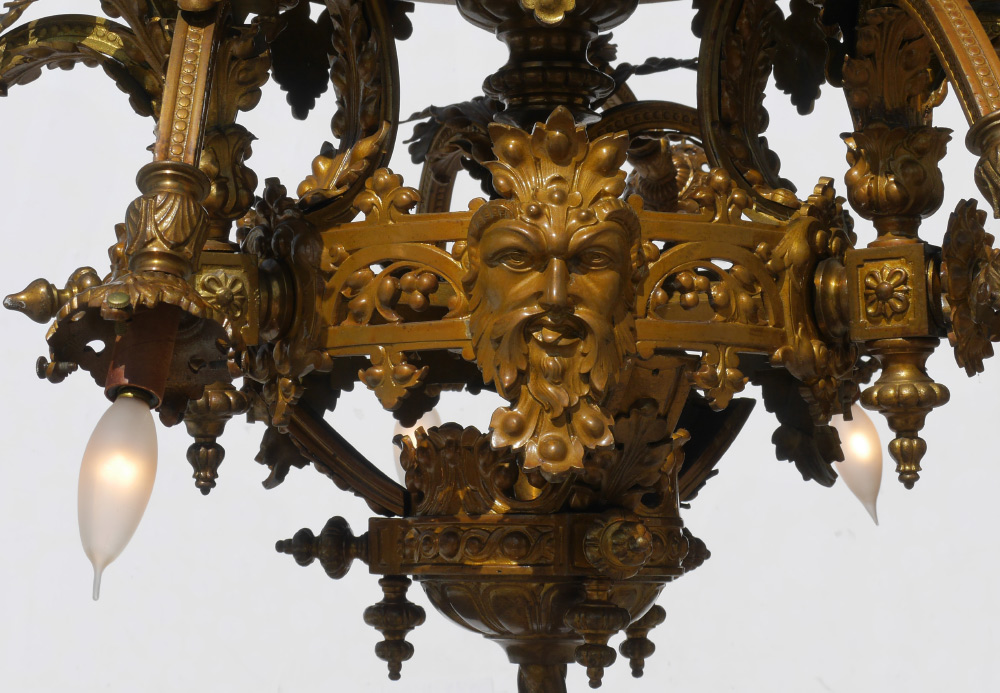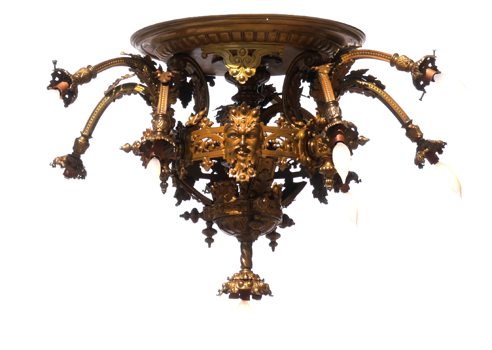 ORNATE VICTORIAN GILDED METAL HANGING LIGHT: 10 light chandelier in the rococo style with applied masquerons and foliate motifs. Overall measures 18 1/2'' h. x 27''.