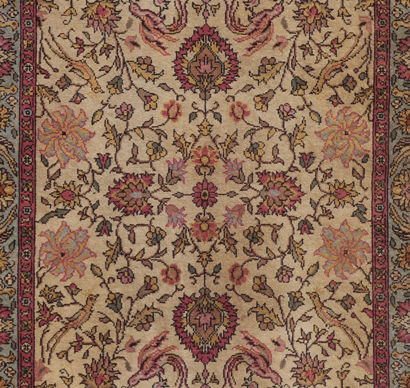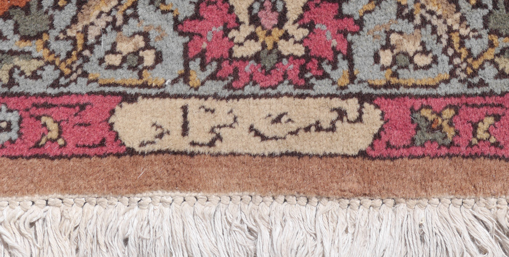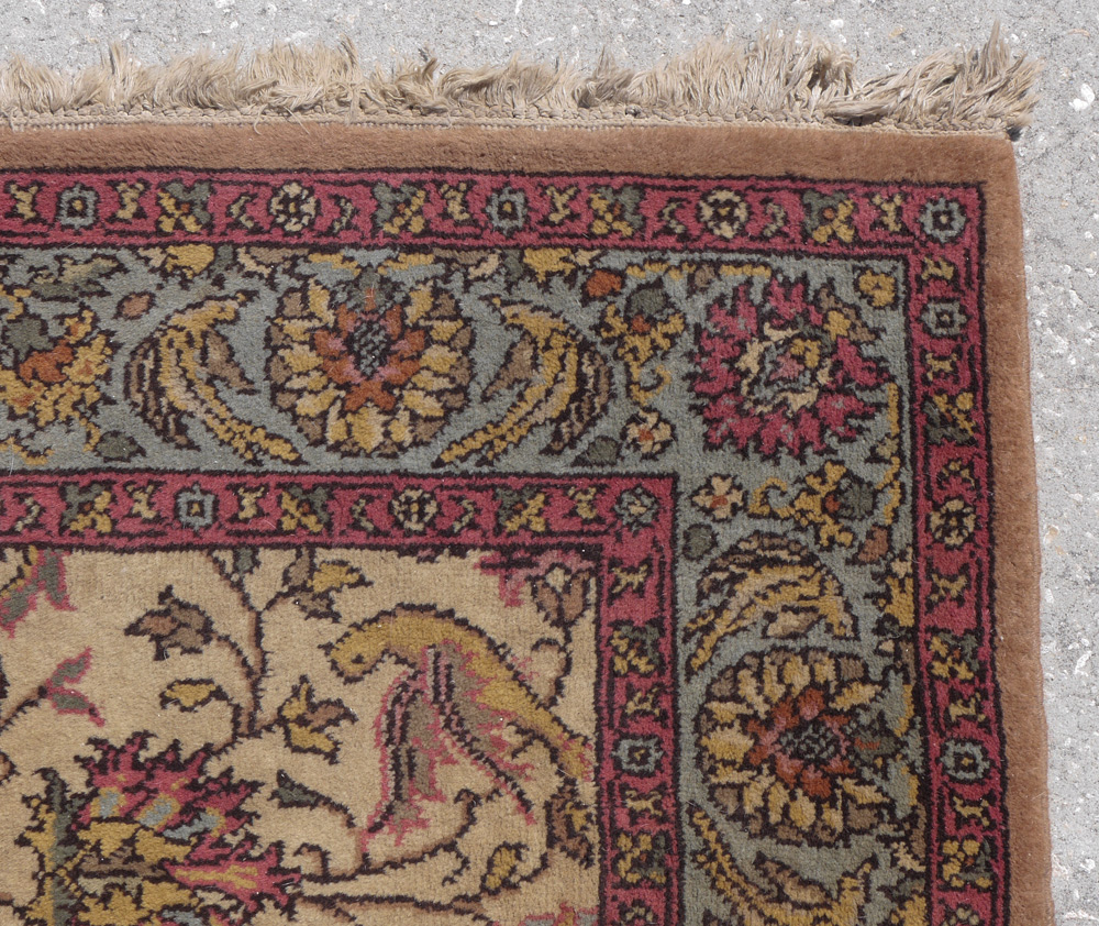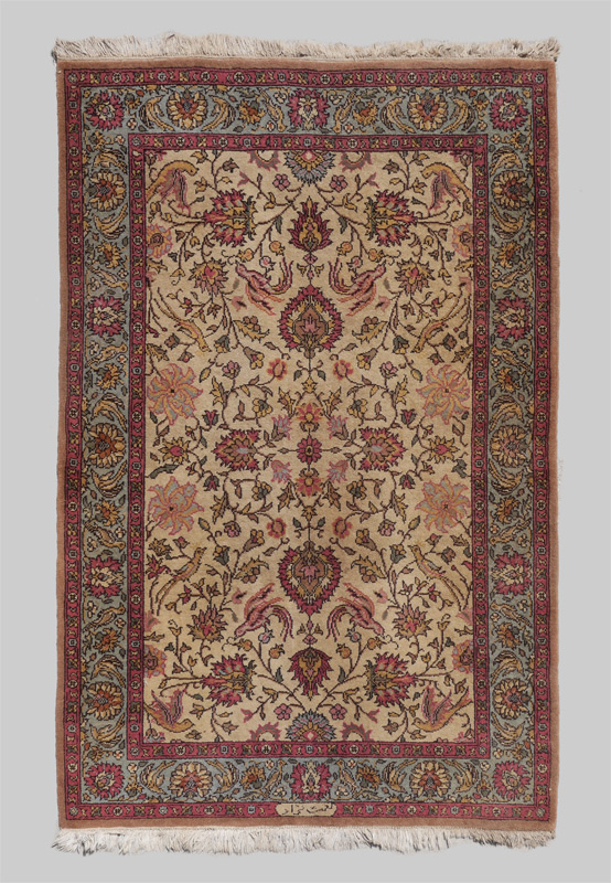 APPROX. 20-35 YR. OLD ROMANIAN HAND KNOTTED WOOL RUG, 4' x 5'11'': Although this rug was woven in Romania it has a traditional Persian design that consists of an overall pattern of pastel colored palmettes, leaves, and flowers linked by vines and tendrils. Placed here and there among the foliage are found various types of birds. The ivory main field is edged by raspberry red guard borders and a medium blue main border that has more birds and palmettes. There is a signature cartouche found at one end in the middle of the outer edge.