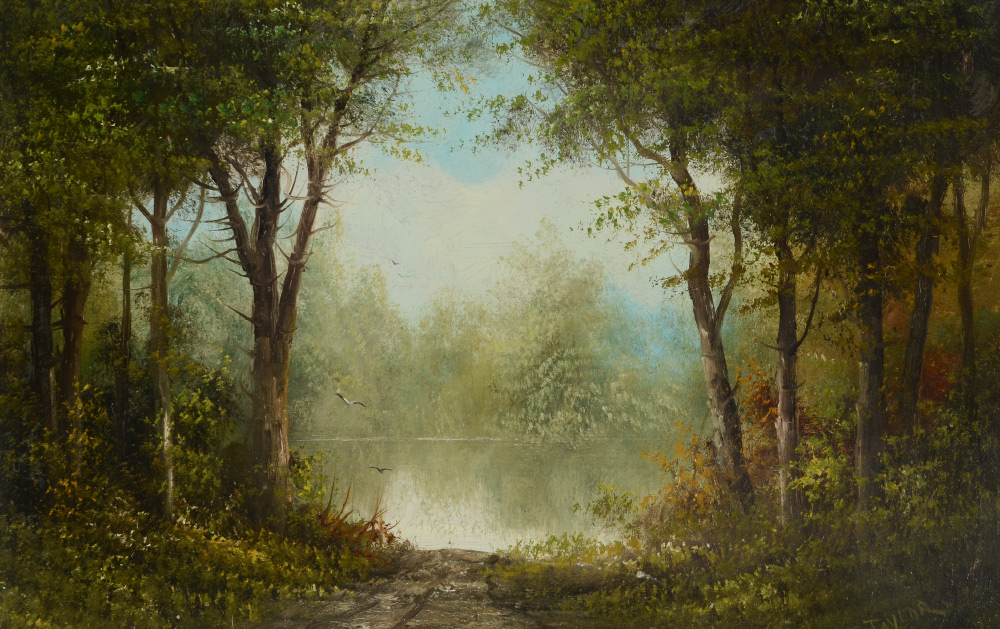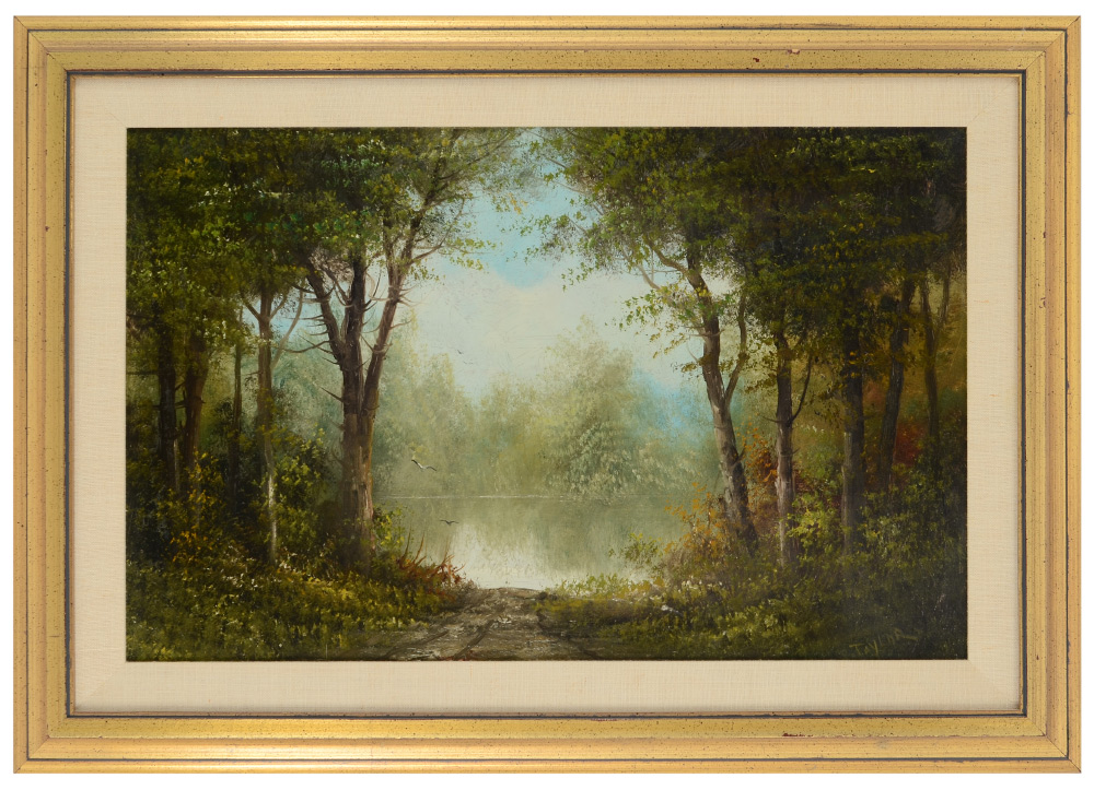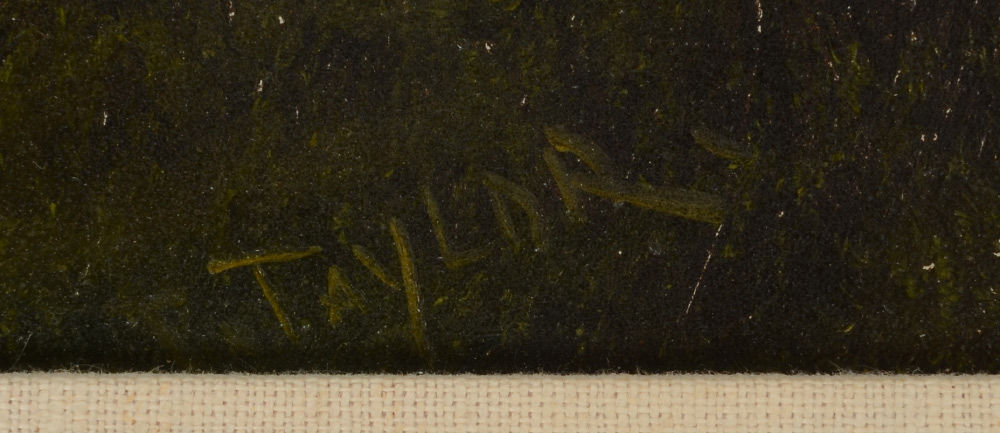AMERICAN SCHOOL PEACEFUL RIVER LANDSCAPE PAINTING SIGNED TAYLOR: Oil/Board, 12'' x 18'', signed lower right, contemporary frame, 17'' x 23''.