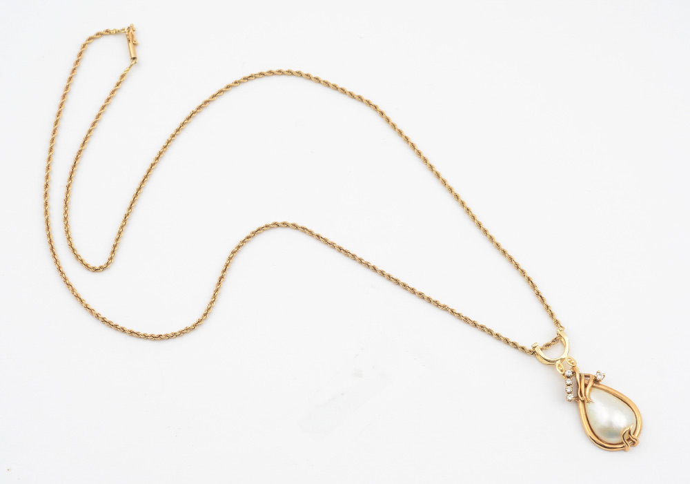 MABE PEARL & DIAMOND PENDANT& CHAIN: 14K yellow gold pendant contains one 20.00 x 13.00 mm pear shaped cultured mabe' pearl. The 5 round brilliant cut diamonds total approx. .20 Ct., Rated VS in clarity and H-I in color. The pearl and diamonds are prong set. 14K 24'' rope chain. Weight: 14.0 grams.