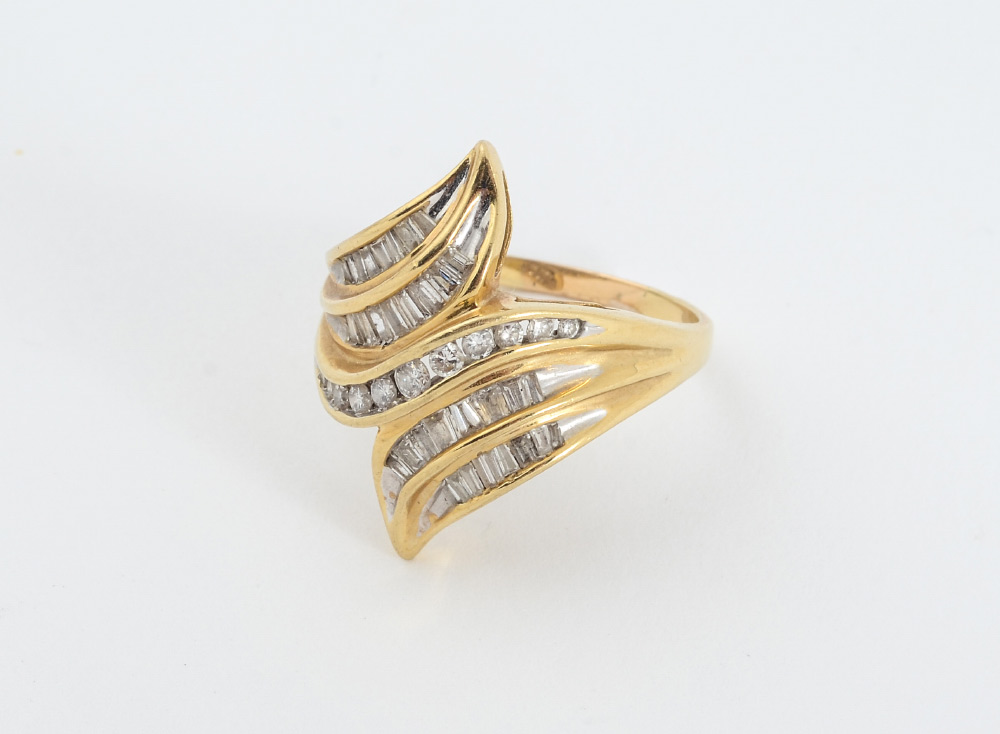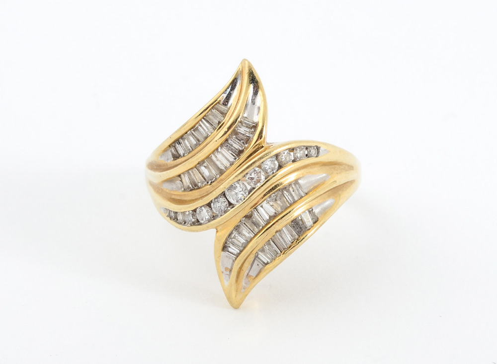 .50 CTW DIAMOND RING: 14K gold diamond ring contains 11 round full cut diamonds and 32 baguette cut diamonds totaling approx. .50 Ct., SI in clarity and G-H in color. The diamonds are channel set. Weight: 6.0 grams. Size: 9.5