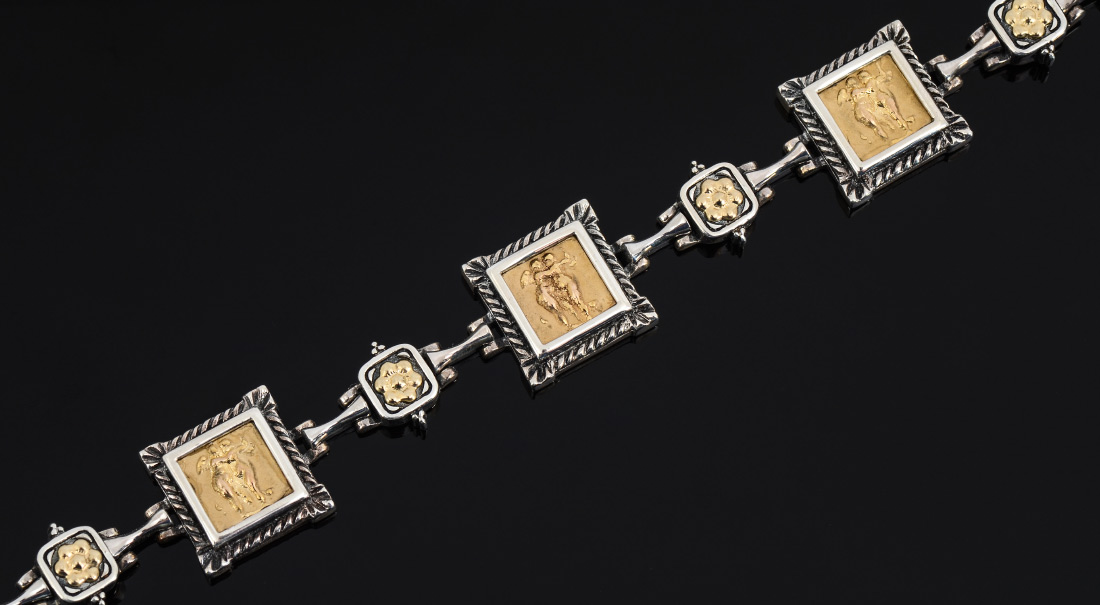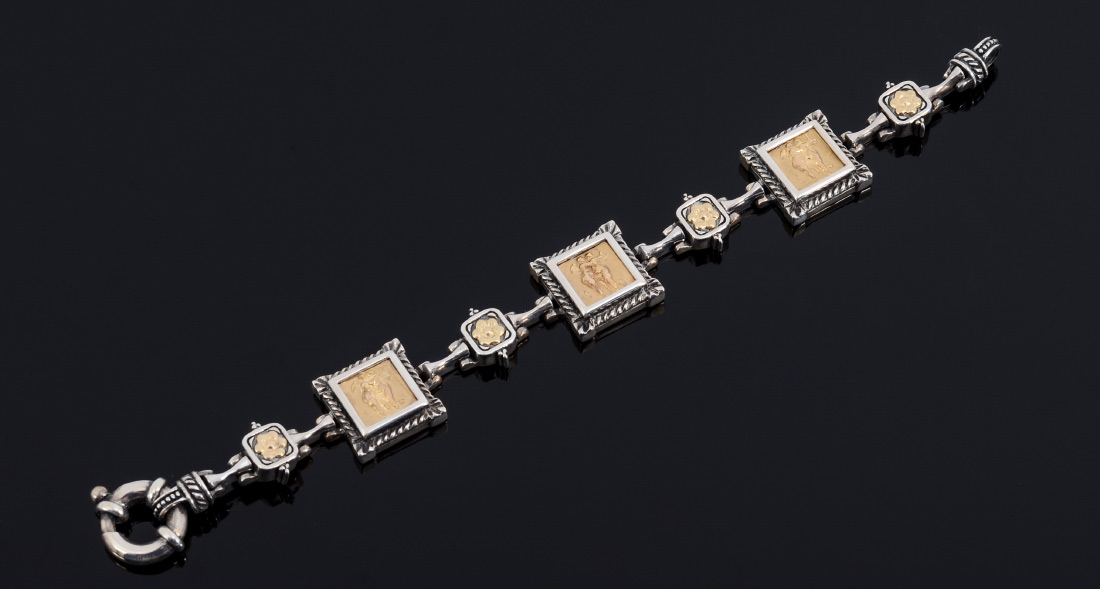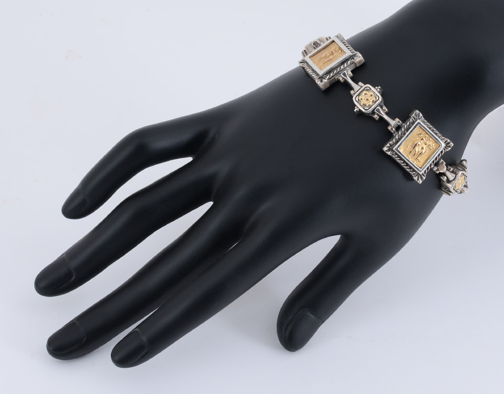 TAGLIAMONTE 18K & STERLING BRACELET: Psyche and Eros depicted on 18K gold plaques. Signed Tagliamonte and Menegatti. Length 7.5'', Weight 35.2 grams. Toggle clasp. Pre-owned but never worn.