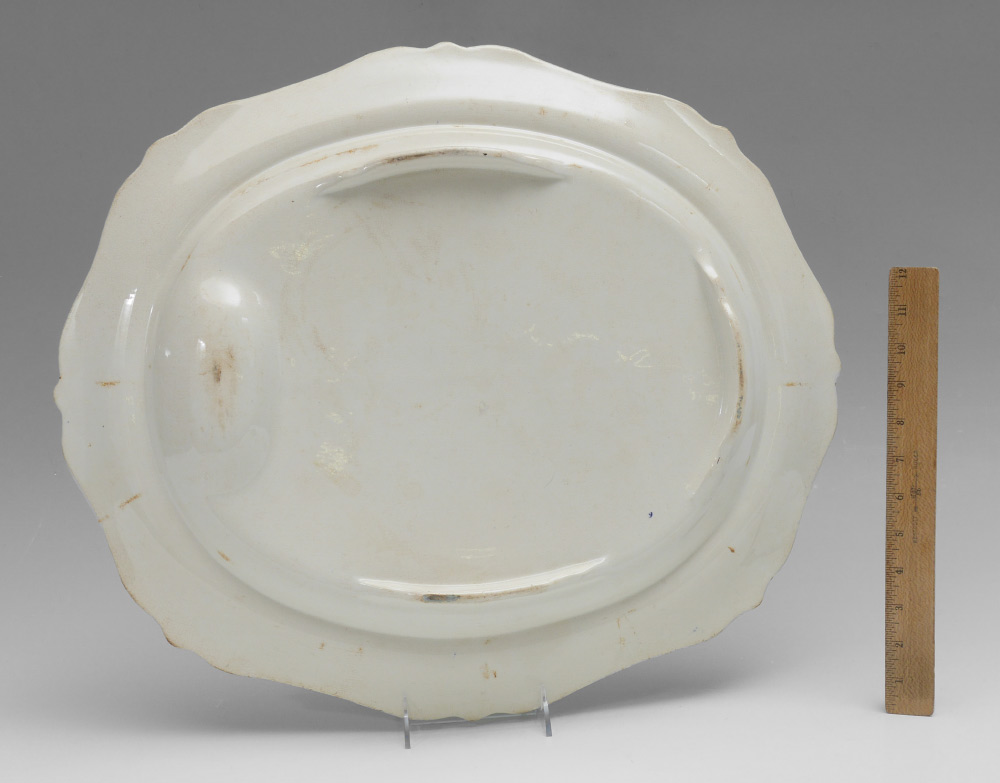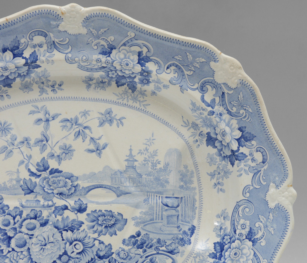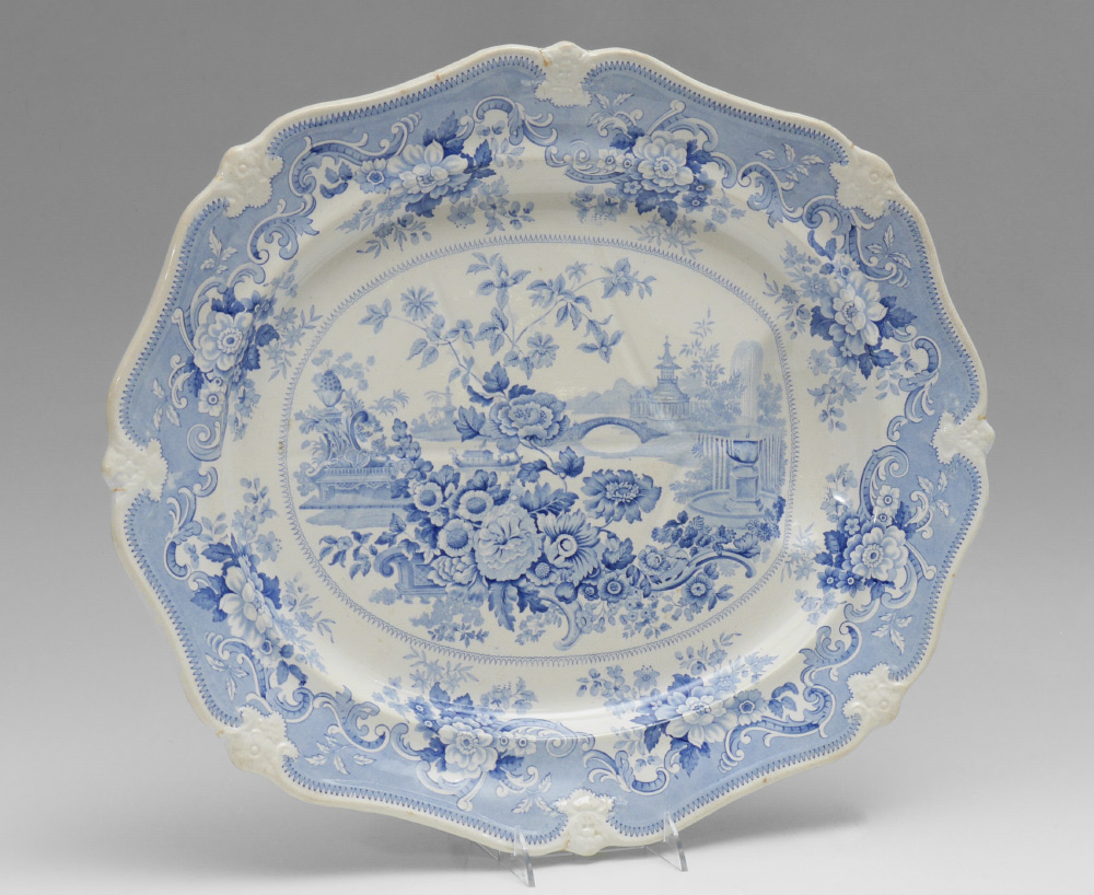 A LARGE STAFFORDSHIRE BLUE TRANSFERWARE PLATTER: Meat platter with well, raised on feet. 21 1/2'' x 18 1/2''