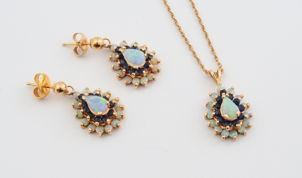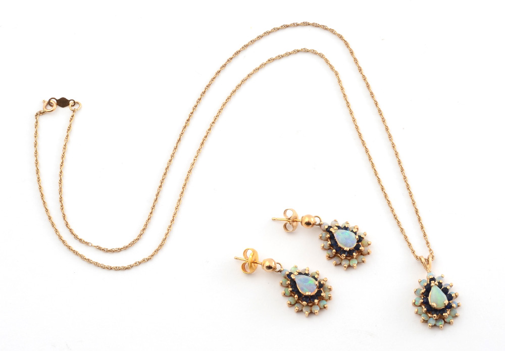 OPAL EARRING AND NECKLACE SET: 14K yellow gold earrings and necklace with pear shaped cabochon cut opals and round faceted sapphires. All gemstones are prong set. Post and nut closures. 14K 18'' chain. Weight: 9.2 grams.