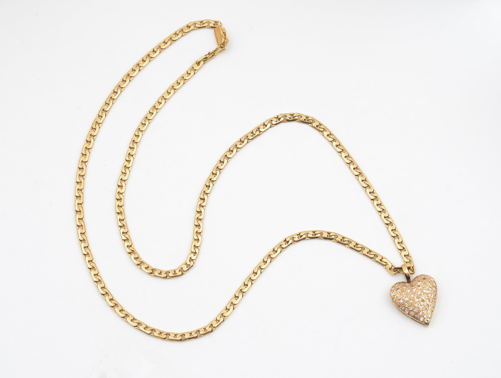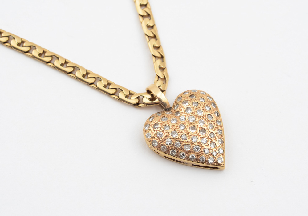 DIAMOND HEART PENDANT NECKLACE: 14K gold diamond heart pendant contains 58 round full cut diamonds totaling approx. 1.00 Ct., rated SI in clarity and H-I in color. The diamonds are deep set. ''C'' link chain is 24''. Weight: 28.7 grams.