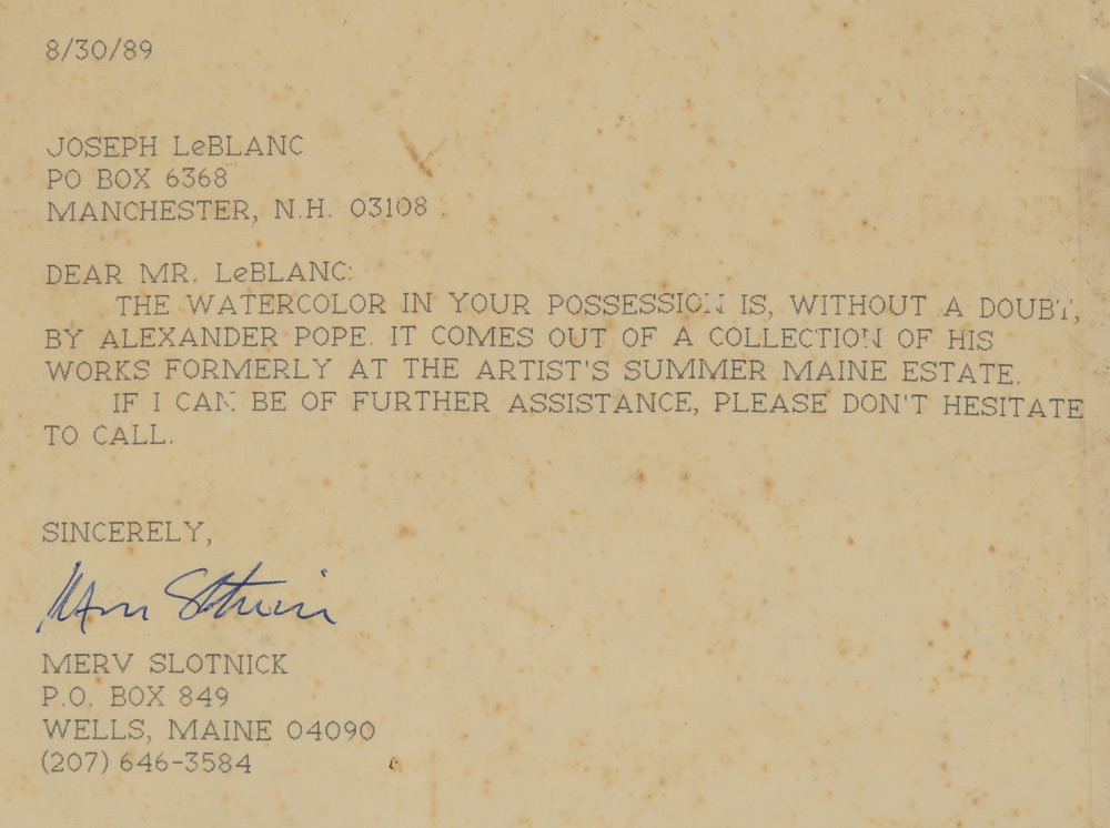 POPE, Alexander, (American, 1849-1924): Landscape, Watercolor, 7 1/4'' x 10 1/4'' sight size, authentication letter from Merv Slotnick verso, framed, 17 1/2'' x 20''.