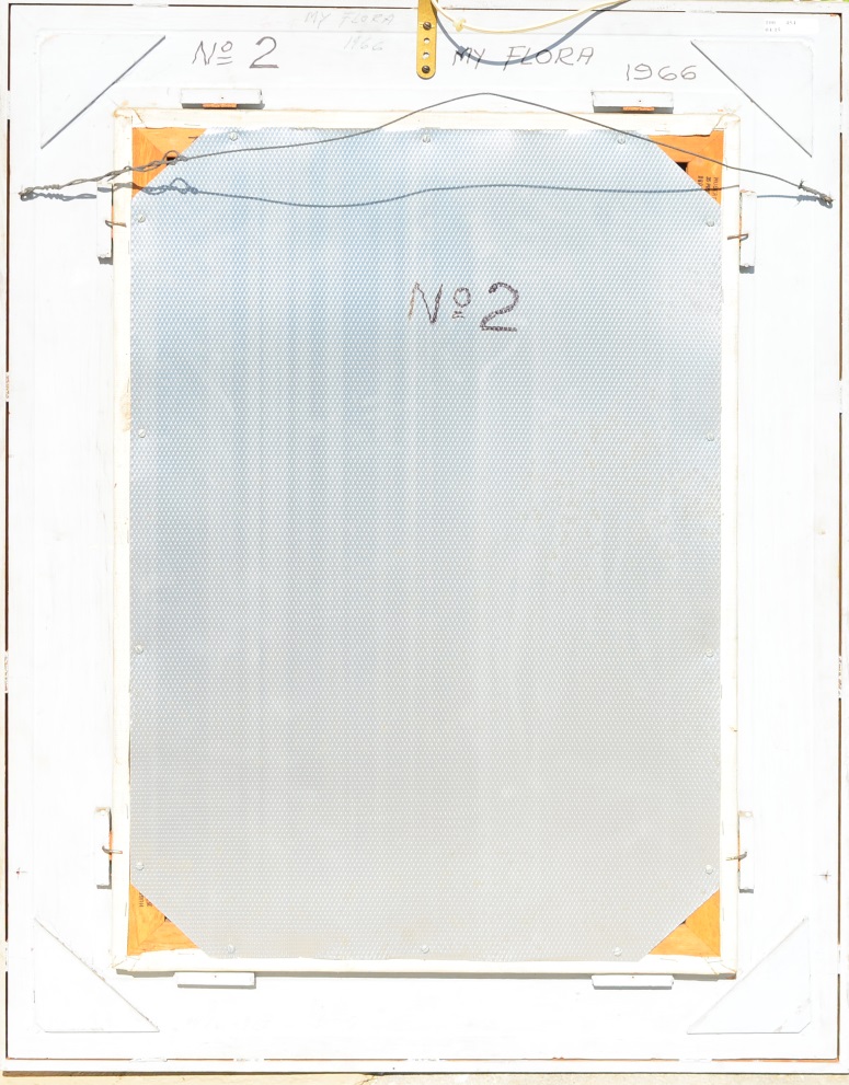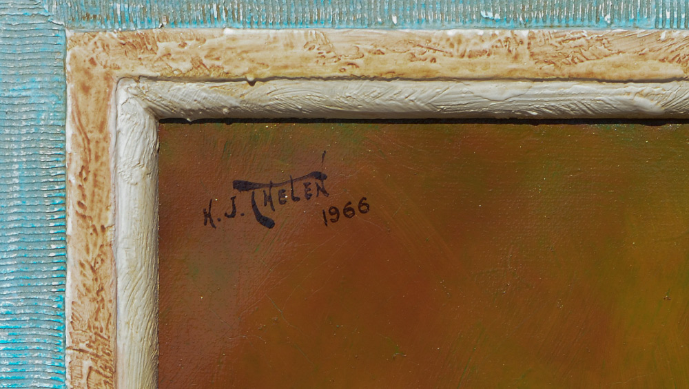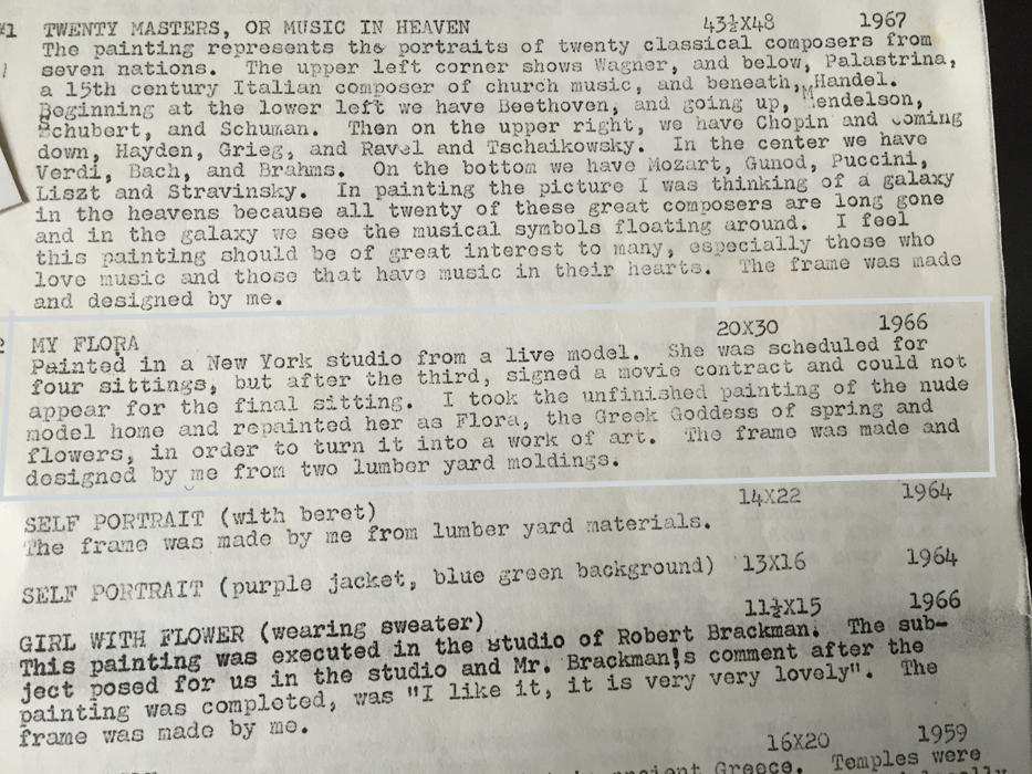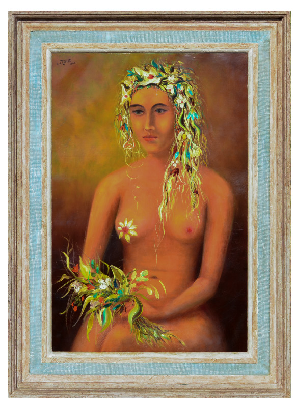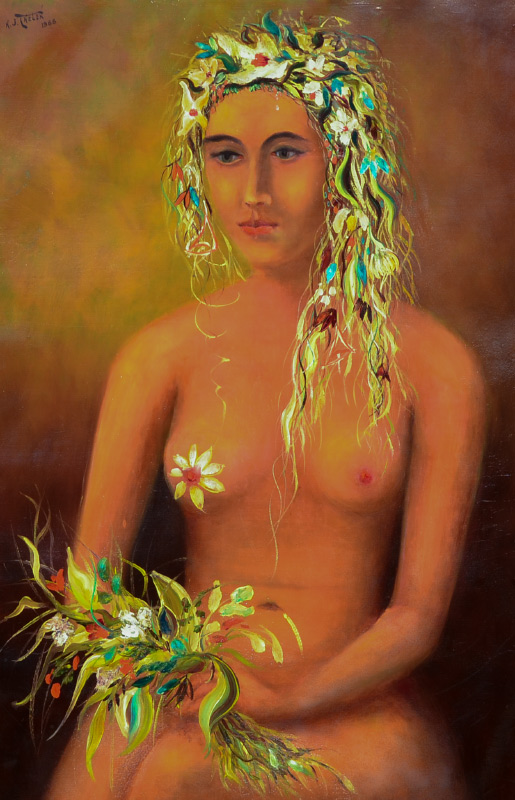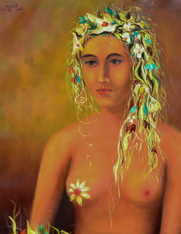 THELEN, Hubert J., (American, 20th Century): ''My Flora'', figural nude with flowers, Oil/Canvas, signed and dated 1966 upper left, titled and dated on back of frame, 30'' x 20'', frame 38'' x 28''. #2 From the Artists Raisonne, in his words, ''MY FLORA, 20X30, 1966 Painted in a New York studio from a live model. She was scheduled for four sittings but after the third, signed a movie contract and could not appear for the final sitting. I took the unfinished painting of the nude model home and repainted her as Flora, the Greek Goddess of spring and flowers, in order to turn it into a work of art. The frame was made and designed by me from two lumber yard moldings''. Provenance: Hubert J. Thelen Estate.