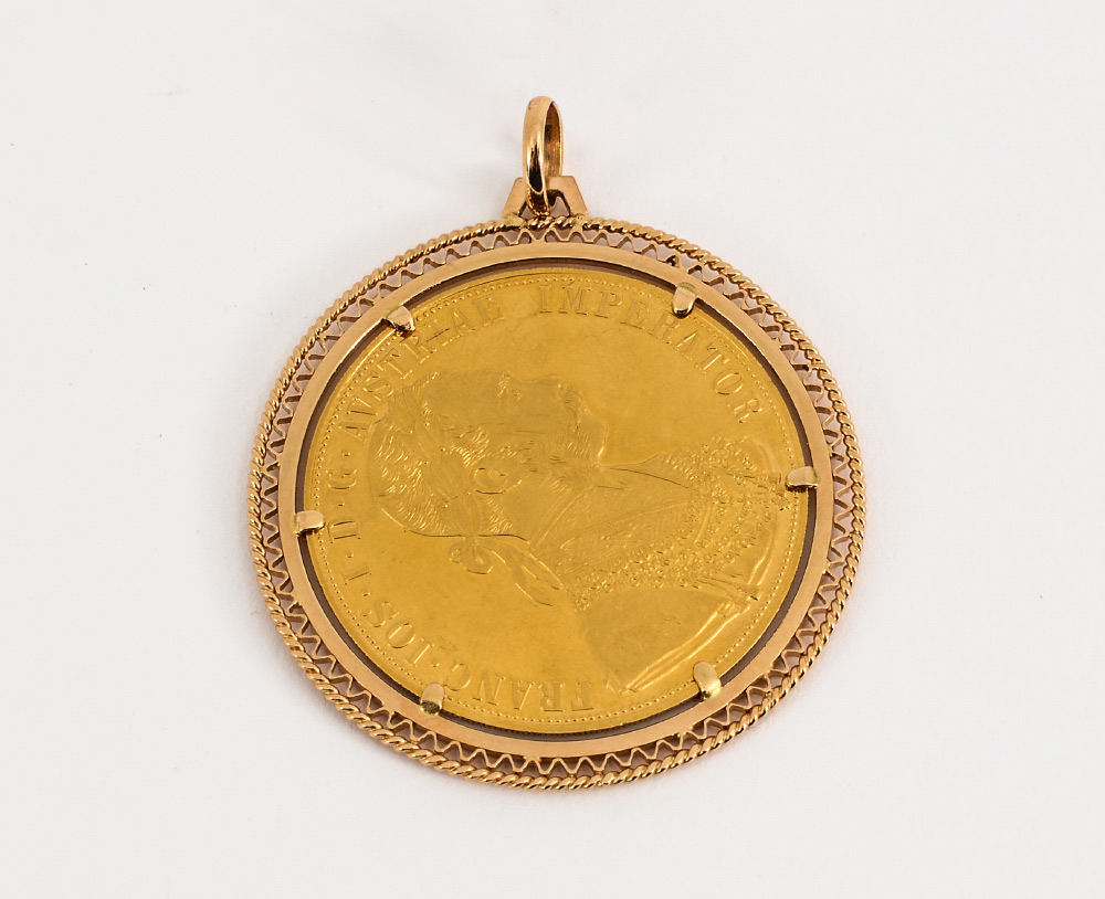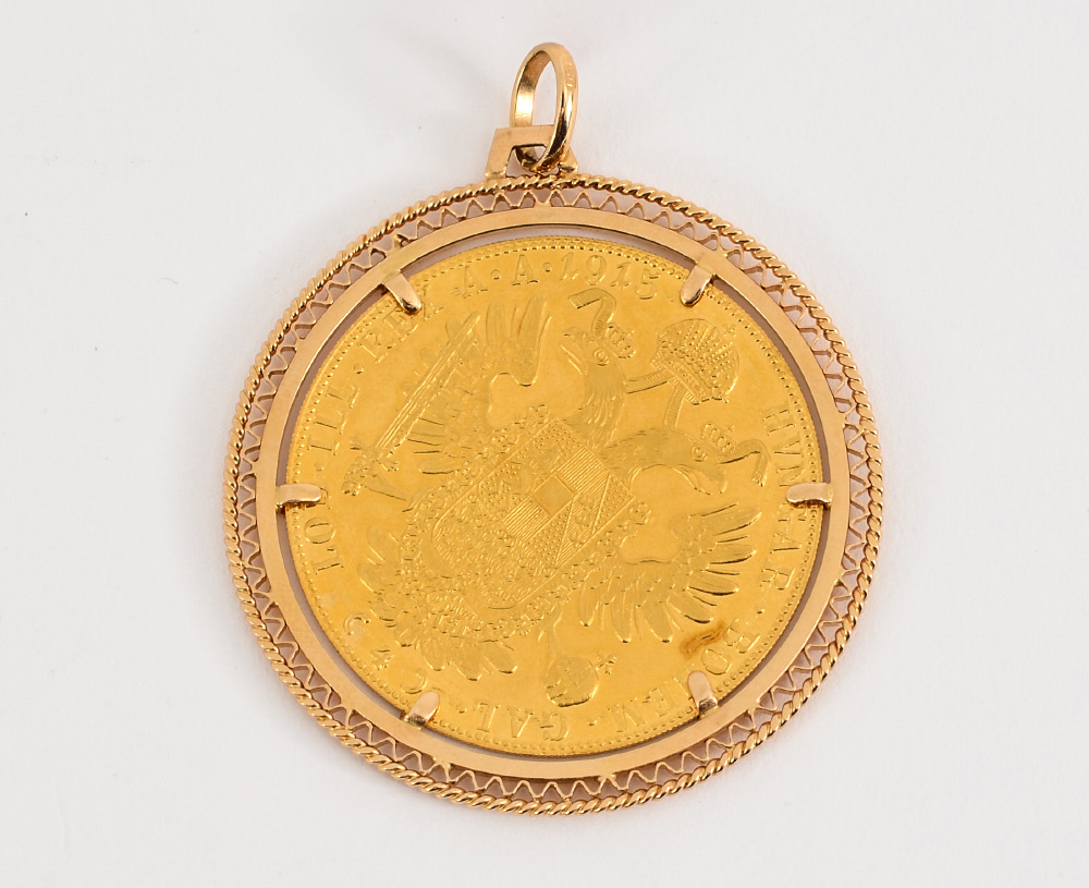 AUSTRIAN 1915 4 DUCAT GOLD COIN PENDANT: Official restrike coin bezel set in 18k gold reticulated frame. 2'' dia., approx 21.2 grams total.