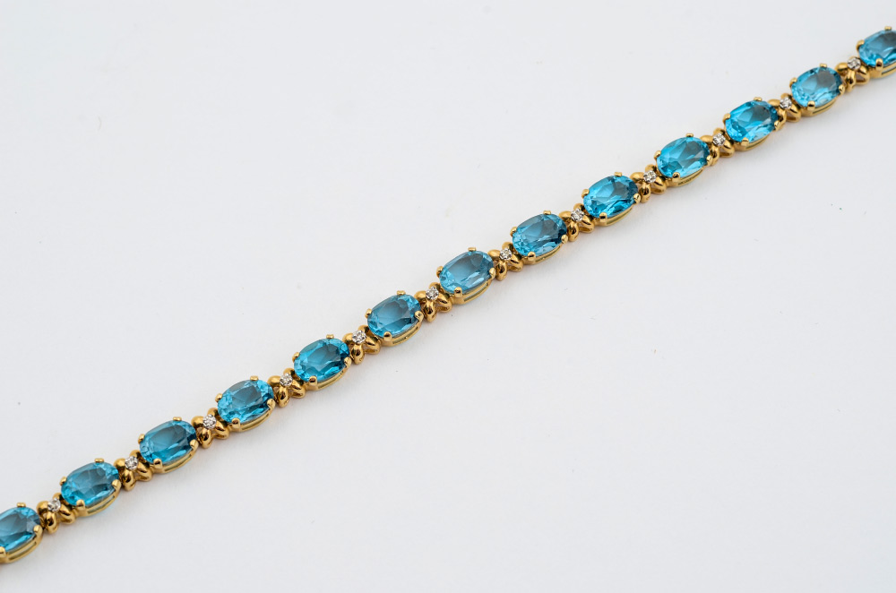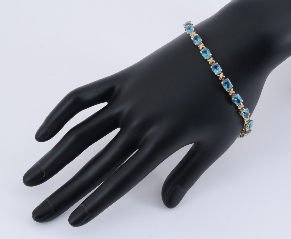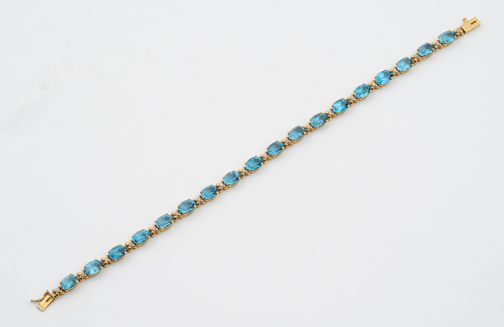 BLUE TOPAZ & DIAMOND BRACELET: 14K yellow gold line bracelet of 18 oval mixed cut blue topaz, 7.00 x 5.00 mm., totaling 18.00 Ct., Single cut diamond accents. All stones are prong set. Weight: 11.0 grams. Length: 7''