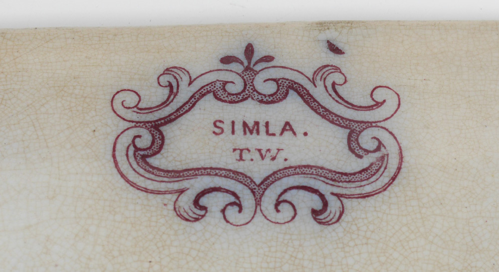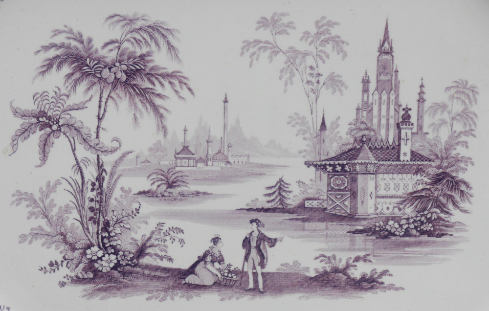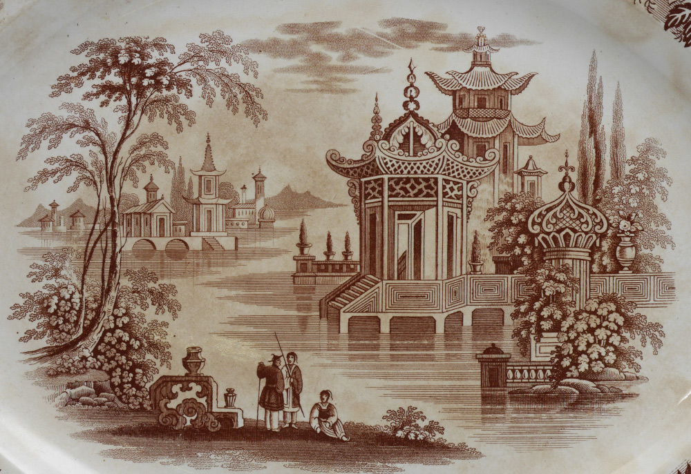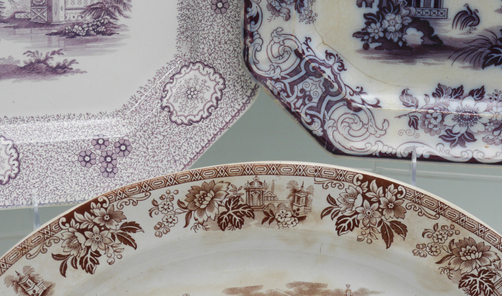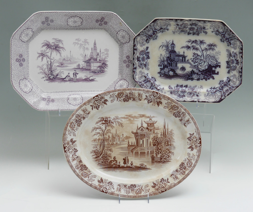 3 ROMANTIC STAFFORDSHIRE TRANSFERWARE PLATTERS: One each of purple, Mulberry and brown. Smallest measures 15 1/2'' x 12'', the largest 19'' x 14 1/2''.
