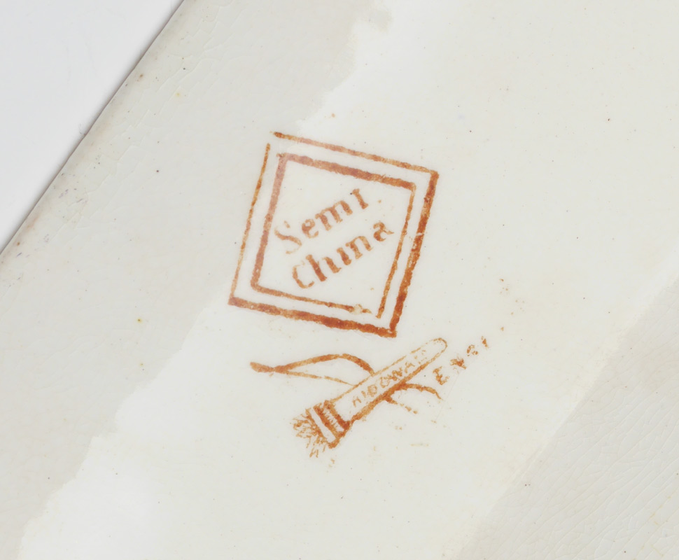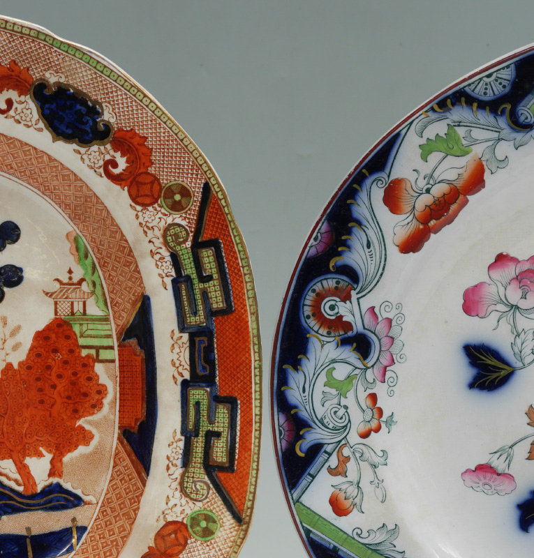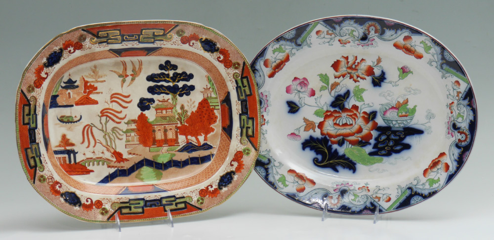 TWO 19TH C STAFFORDSHIRE PLATTERS: Bright and bold coloration in the Imari style. One is by Ridgway, 17 1/2'' x 14'', the unmarked measures, 17 1/4'' x 14''.