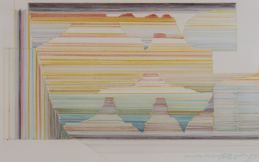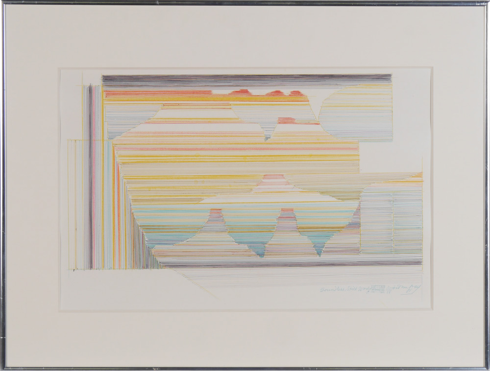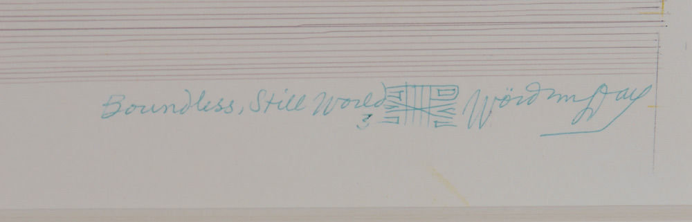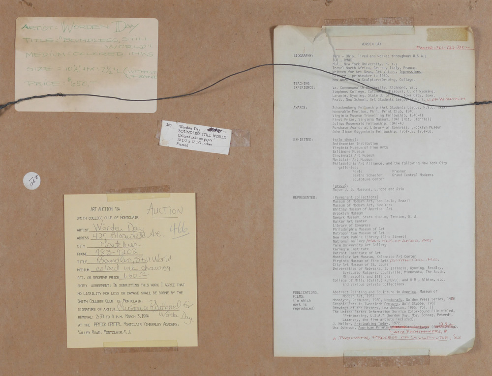 DAY, Worden, (American, 1912-1986): ''Boundless, Still World'', Colored Ink Drawing, sight size 11 1/2'' x 18'', signed and titled lower right, framed, 18 1/4'' x 24 1/4'', numerous labels affixed verso.