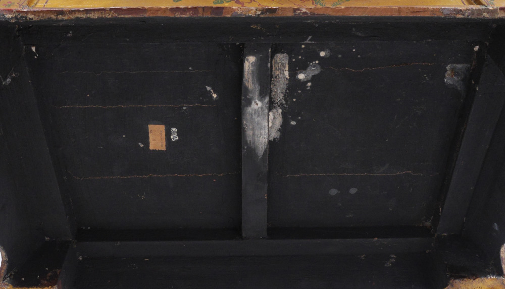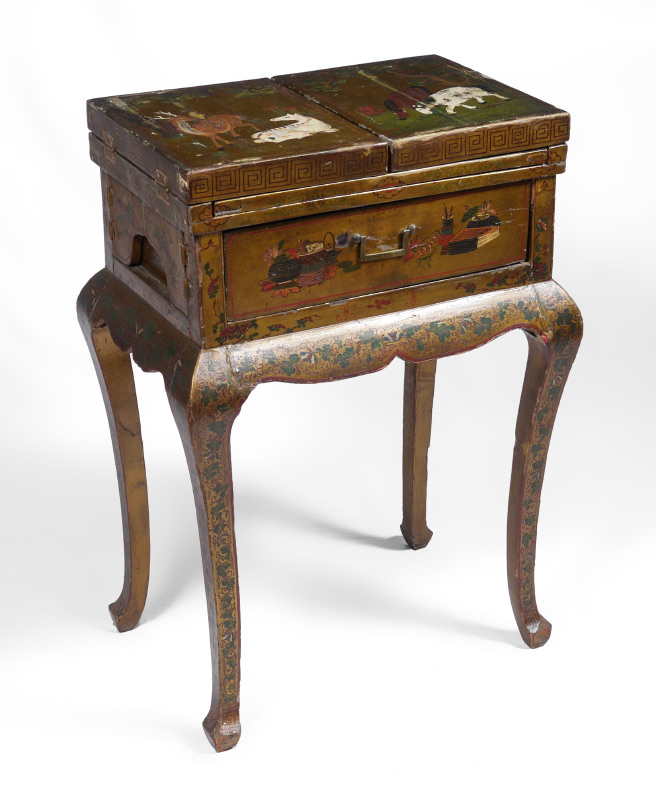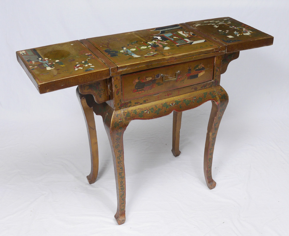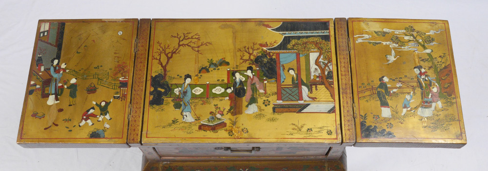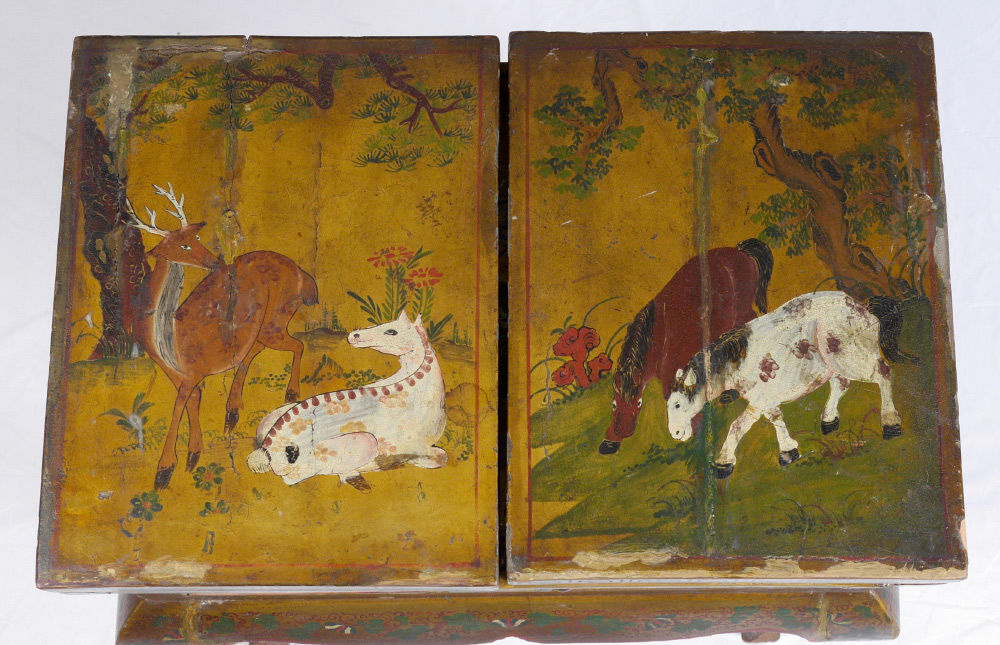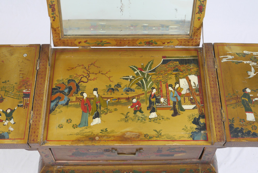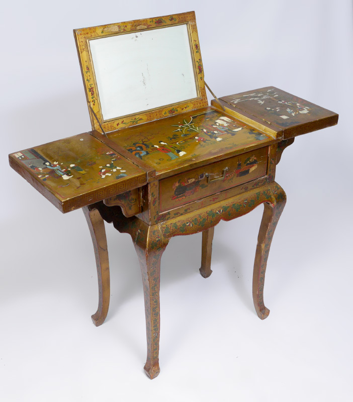 19TH CENTURY CHINESE PAINT DECORATED TABLE: Highly decorated folding top dressing table, flip top panels with deer and horses motif opens to outdoor genre scenes of mothers and children. Center lifts to beveled glass mirror. Single drawer, shaped skirt and legs with foliate motifs. Overall 34 1/4'' h. x 24 1/4'' x 16 1/4''.