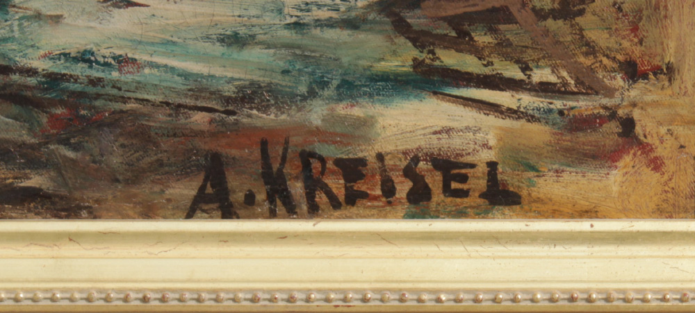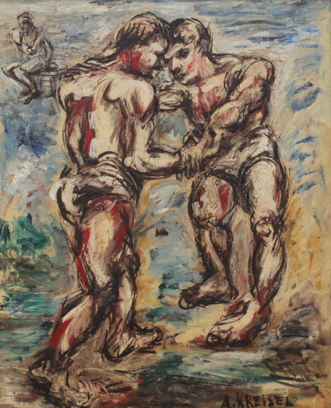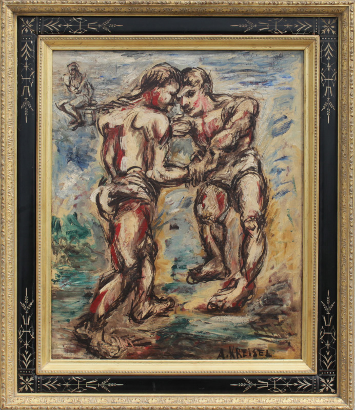 FREISEL, Alexander, (American, 1901-1953): Men Wrestling, Oil/Canvas, 27'' x 22'', signed lower right, encased in gilded and ebonized Victorian frame, 35'' x 30''.