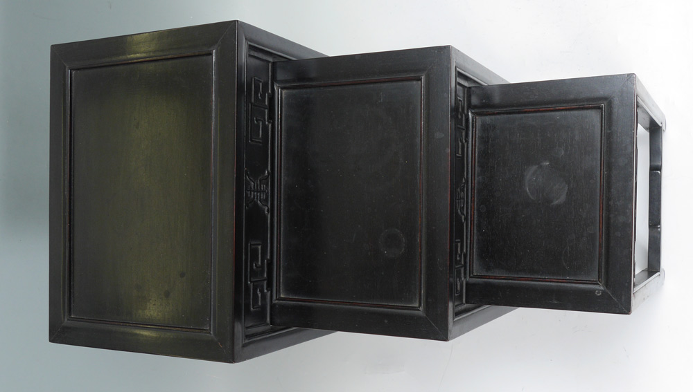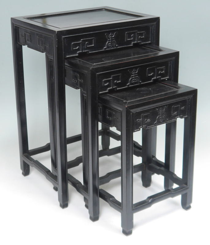 NEST OF 3 CHINESE SIDE TABLES: Ebonized nest of 3 tables with carved and shaped skirts, tallest measures 24 1/4'' h. x 16 1/4'' x 12 1/2''.