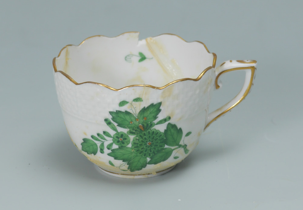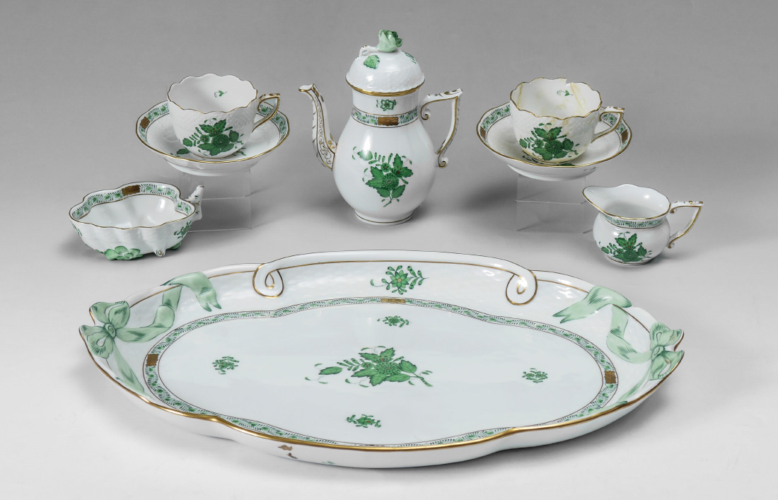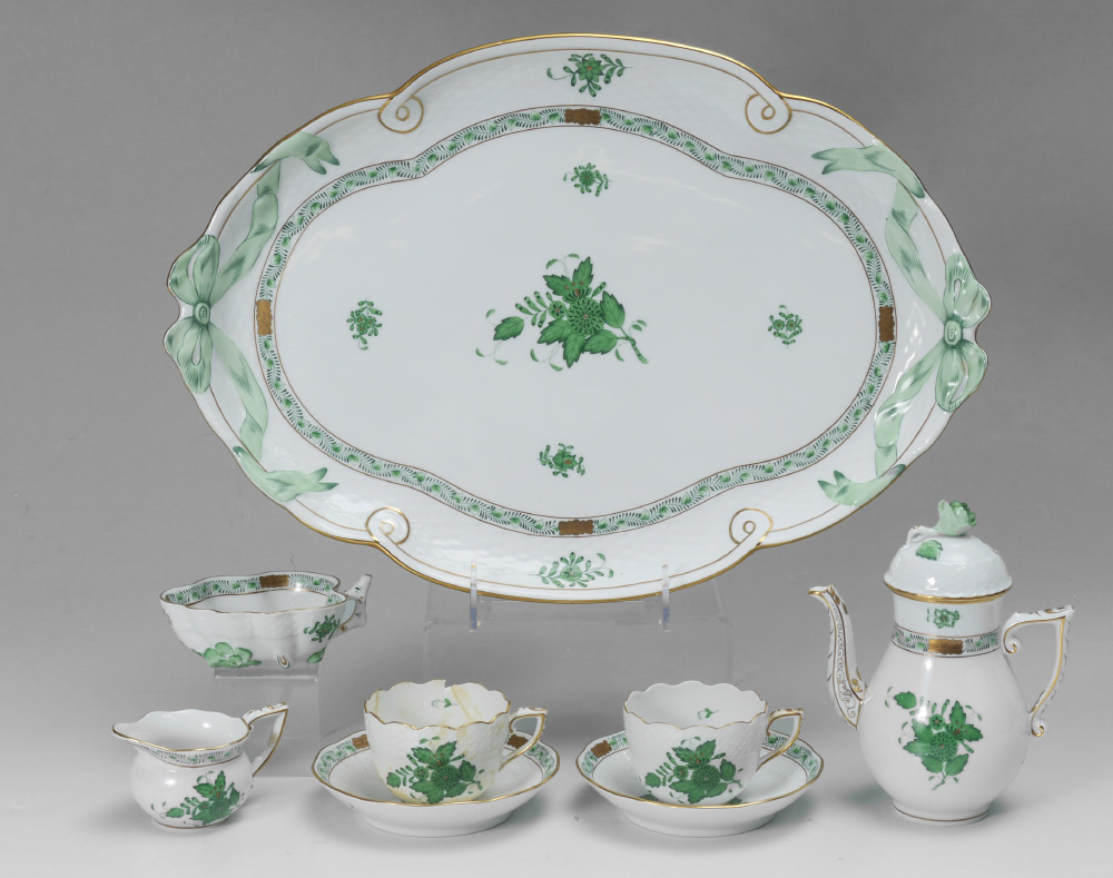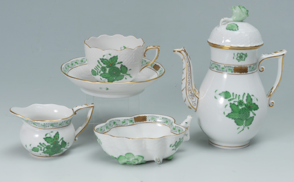 HEREND PORCELAIN CHINESE BOUQUET CABARET SET: Coffee pot (6''), cream pitcher (6''), leaf shape open sugar, cup, saucer, and the 15 1/2'' tray.