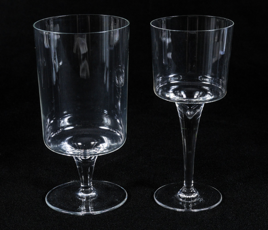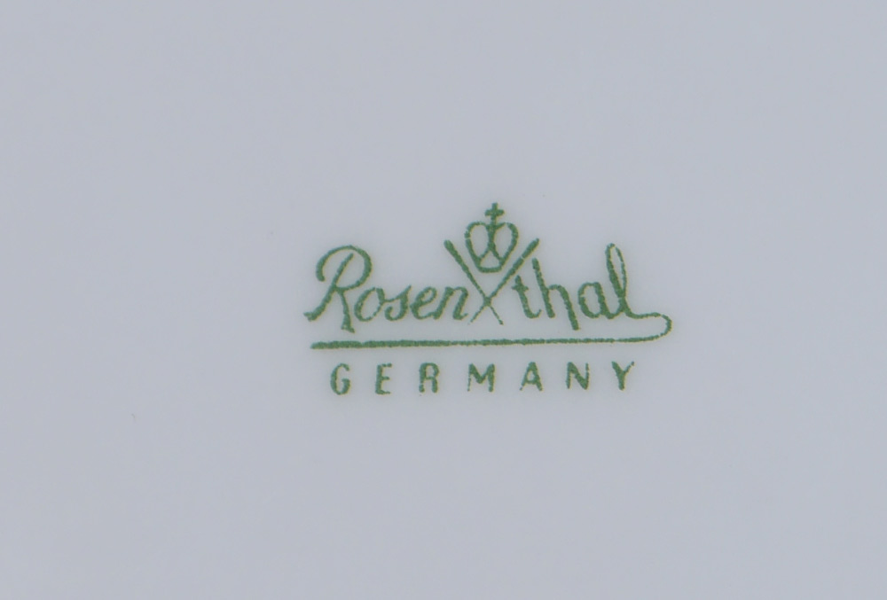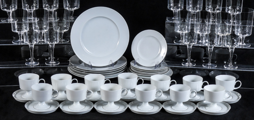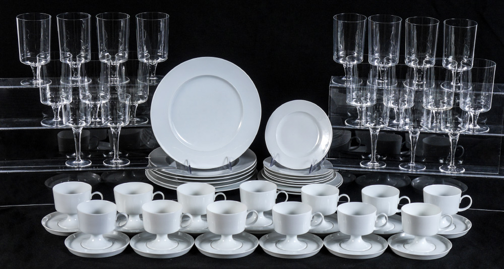 73 PIECE ROSENTHAL WHITE CHINA SERVICE: Approx. 73 pieces in a moderne white design by Rosenthal to include 8 dinner plates (10''), 7 salad plates, 6 bread plates, 10 double handled cream soups, 13 underplates, 13 teacups, 13 saucers, covered vegetable, open vegetable (11 1/2''), covered sugar. Sold with 5 Rosenthal white wine glasses (6''), 15 Rosenthal tumblers (6'').