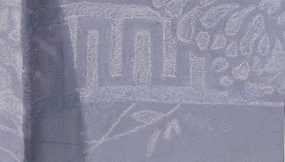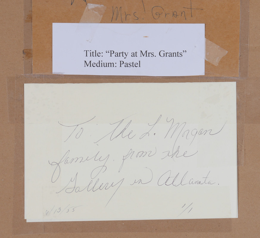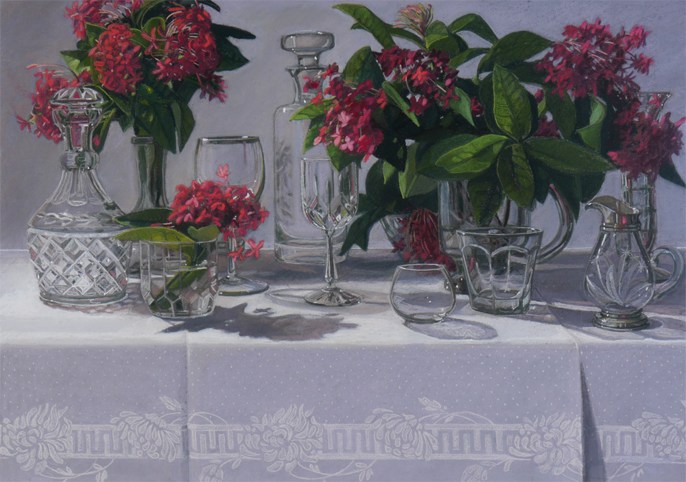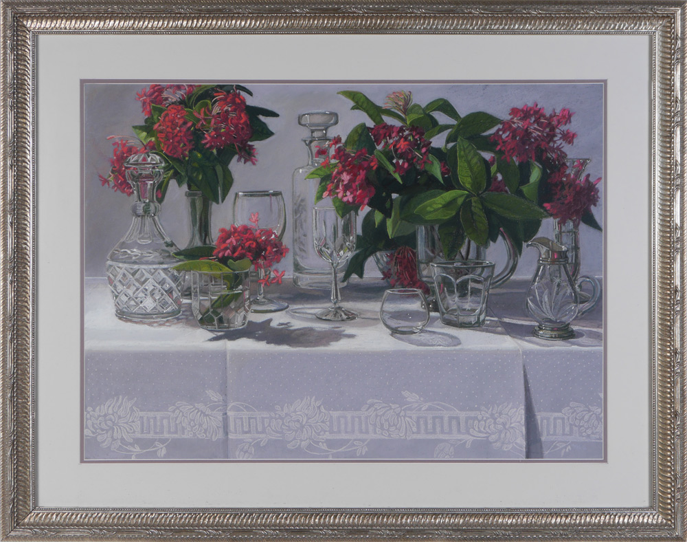 HERSCHER, Patty, (American, 20th C.): ''Party at Ms Grants'', Table top decorated with flowers and crystal, sight size 21'' x 29'', signed lower right and dated 1986, framed, 30 1/2'' x 39'', label verso.