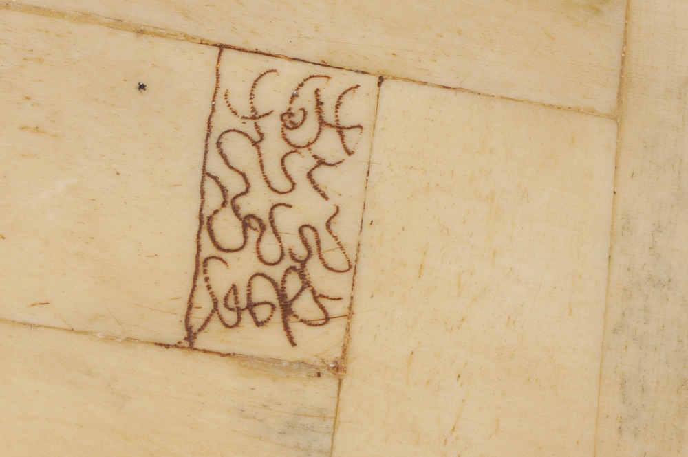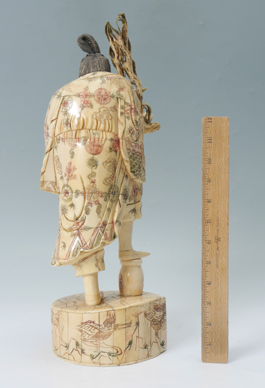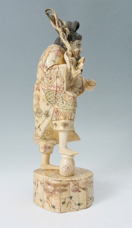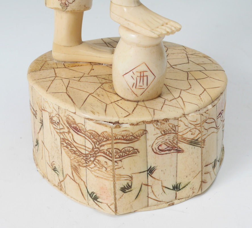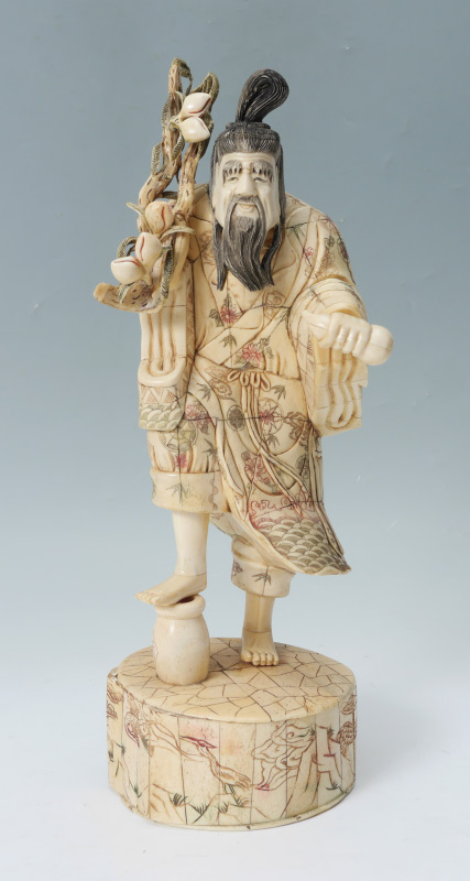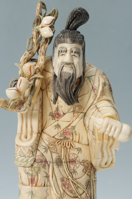 BONE CLAD ORIENTAL FRUIT SELLER: Bone clad figure of a man holding branches with fruit, composite head, standing on base. Overall measures 17 1/2'' h. x 6 1/2'' x 6 1/4''.