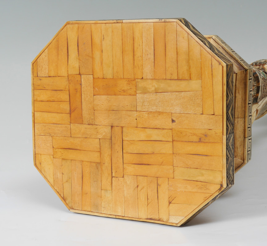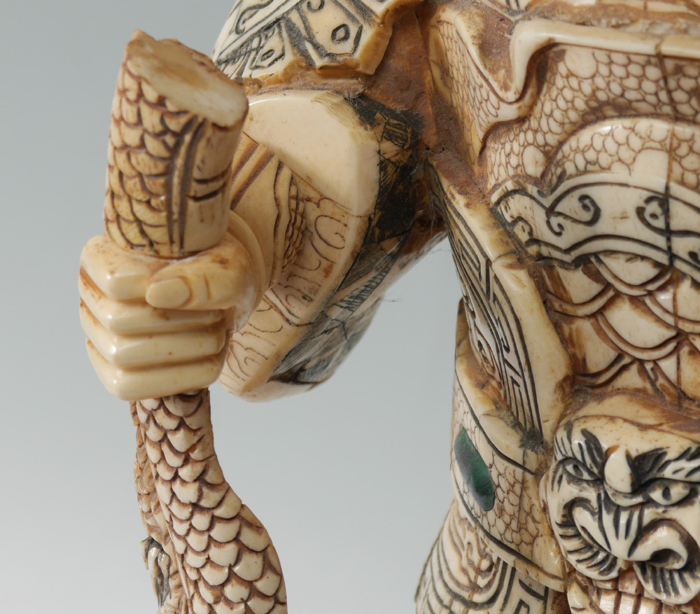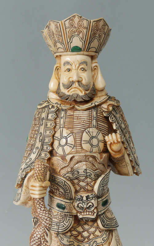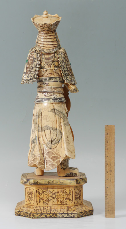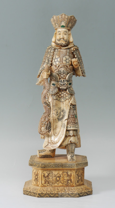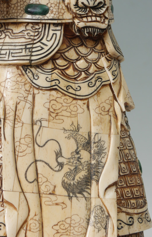 CHINESE BONE CLAD WARRIOR: Figure of a warrior holding a ball in one hand, part of a dragon on the other. Detailed carved body with inset stone cabochons on base. Overall measures 27 1/4'' h. x 10 1/4'' x 9 1/2''.