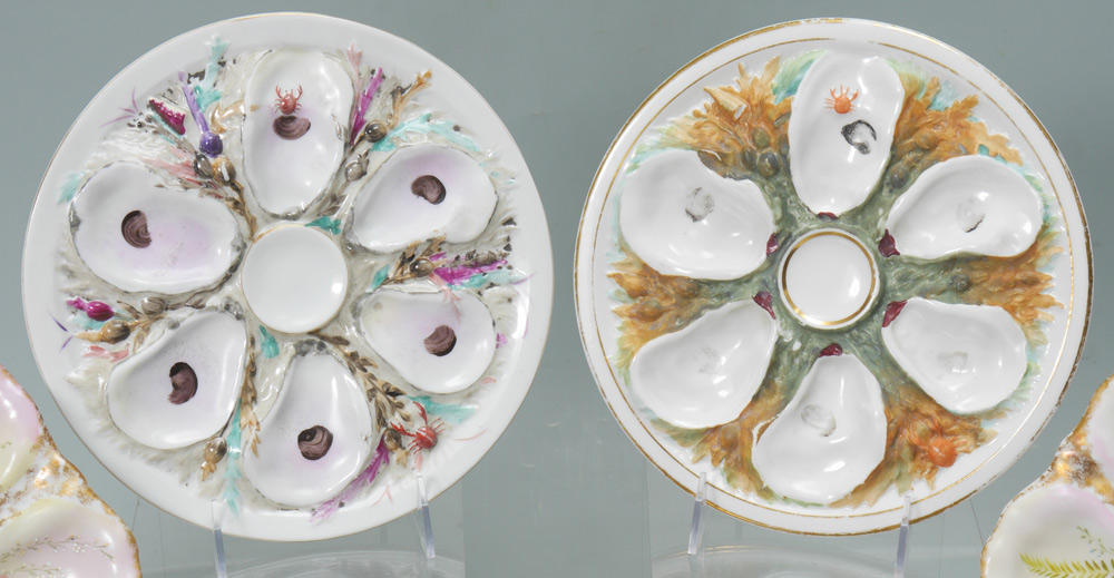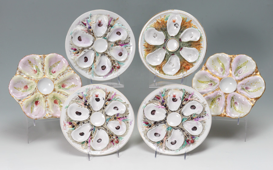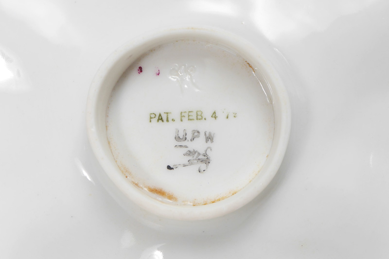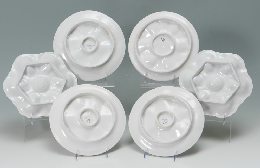 4 UNION PORCELAIN WORKS OYSTER PLATES: 6 oyster plates total, 4 are 6 well by Union Porcelain Works and marked U.P.W. on base with other marks. 2 with only impressed 183 and 87 mark. Average dia. 9 1/4''.