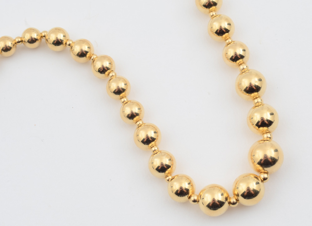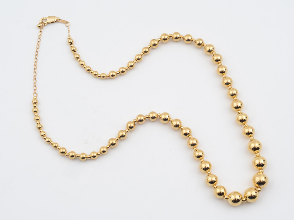 14K GOLD BEAD NECKLACE: Beads graduating in size from 3.5-10 mm. with gold spacers. Approx. 19'' length, with chain adjustment to 17''. Weight 6.6 grams.