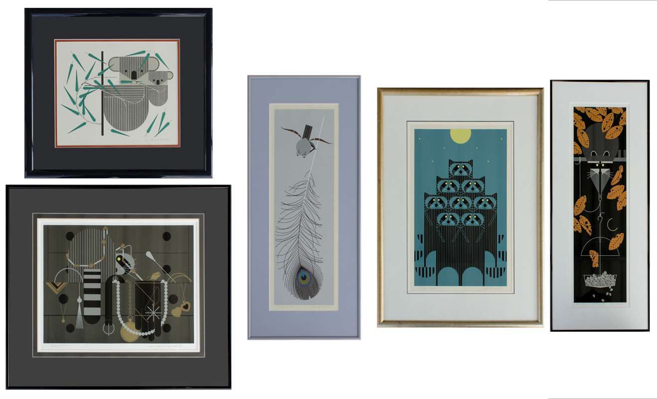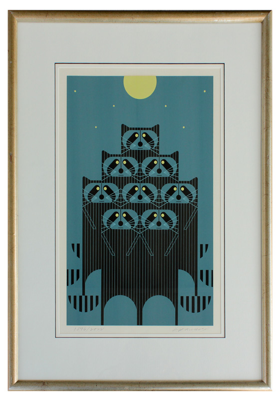 HARPER, Charles, (American, 1922-): 1) Birds of a Feather, Serigraph, sight size 21 1/2'' x 8'', framed, 27'' x 13'', signed and numbered 379/1500; 2) Koala Family, sight size 10 1/2'' x 12 1/2'', framed, 17 1/2'' x 19 1/2'', signed; 3) ''Raccsnack'', sight size , framed, 33 1/2'' x 15'', signed, titled and numbered 424/1000; 4) Raccoon Burglar, sight size 32 1//2'' x 16 1/2'', framed, 40'' x 24'', signed and numbered ; 5) Raccoon Family, sight size 17'' x 11'', framed, 24'' x 18'', signed and numbered 1576/2000, SOLD WITH BOOK BIRDS AND WORDS.