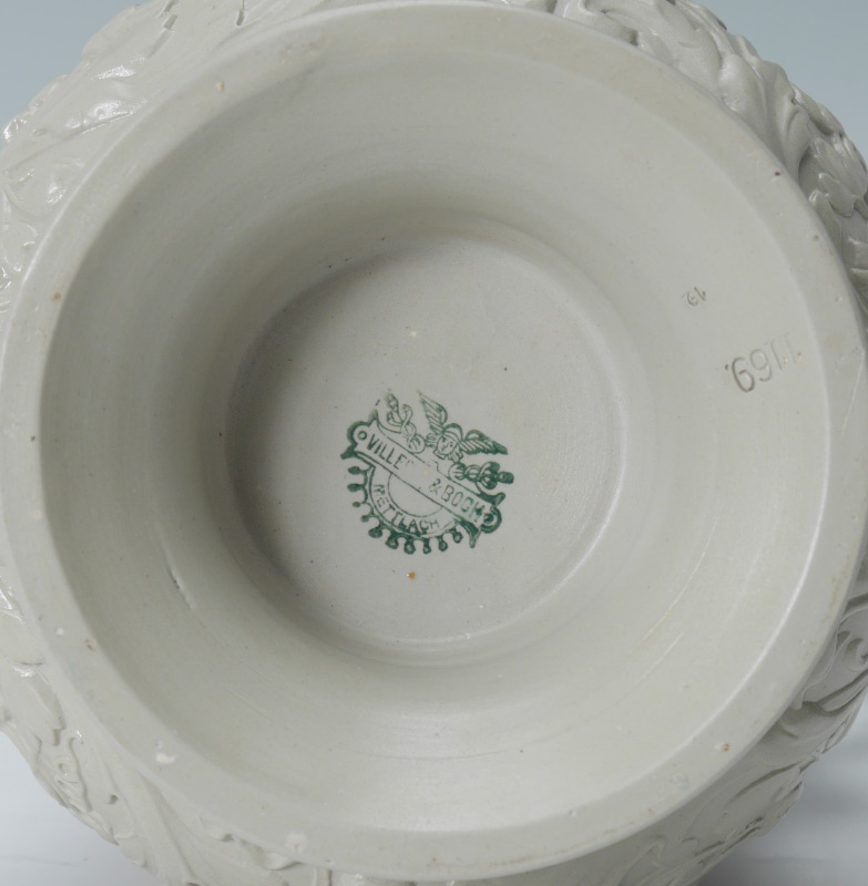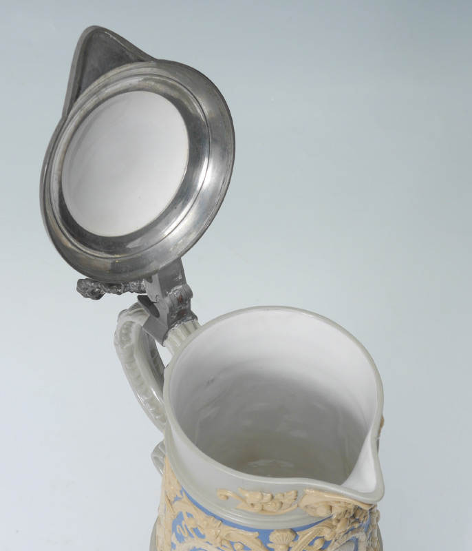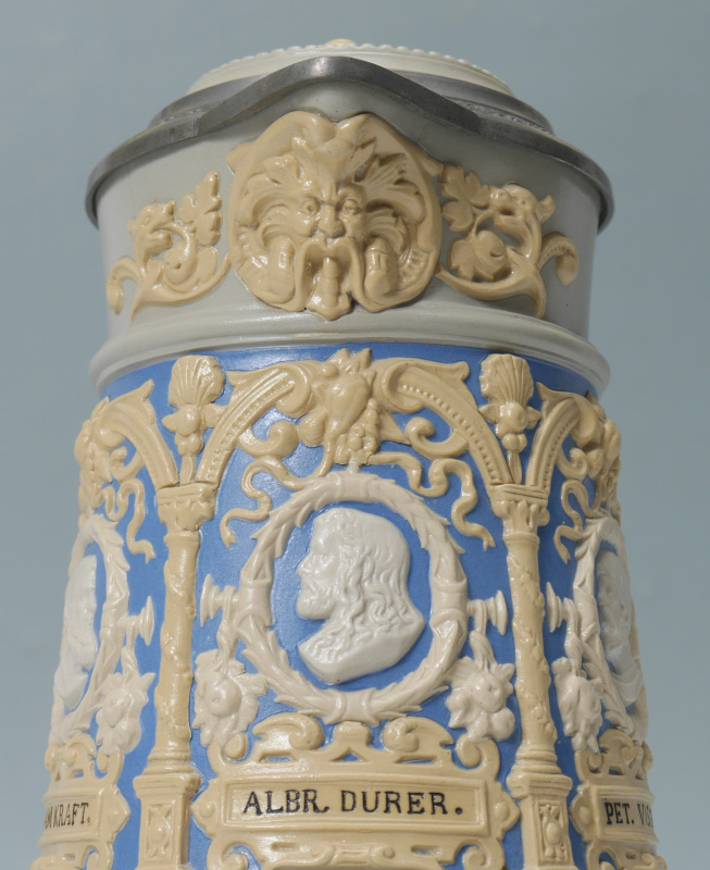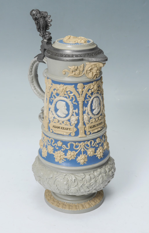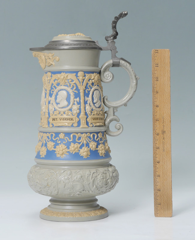METTLACH RELIEF TANKARD 1169: Hinged lid with figural thumbpress, relief decoration wit busts of German artists in medallions, floral motifs. Marked on base with green Villeroy & Boch mark, impressed 1169. Overall measures 15'' h. x 8'' x 6 1/2''.