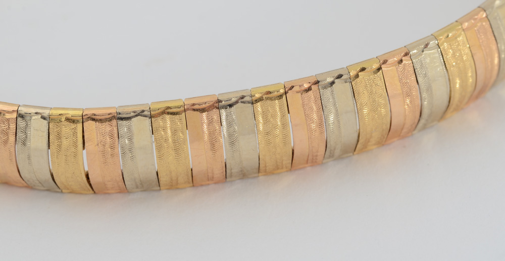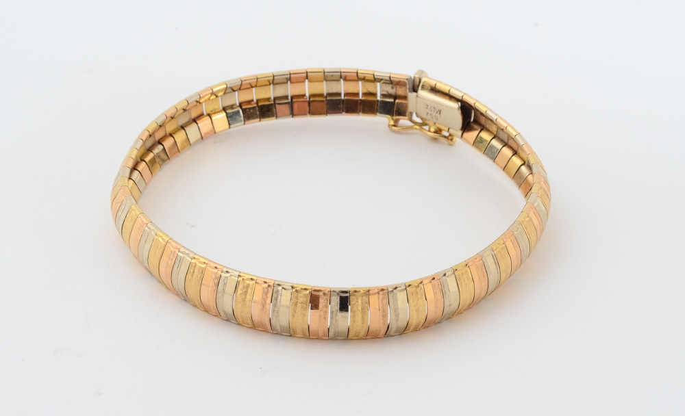 18K TRI COLOR GOLD BRACELET: Bands of white, yellow and rose gold in a flex line bracelet. Length 7.5''. Width .25''. Weight 23.7 grams approx.