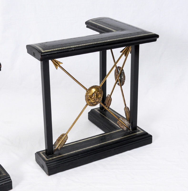 MAITLAND-SMITH REGENCY STYLE FIREPLACE FENDERS: Gold embossed black leather and brass crossed arrows centered by lion head masquerons. 20'' h. x 14'' each.
