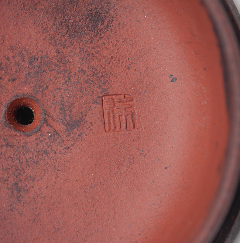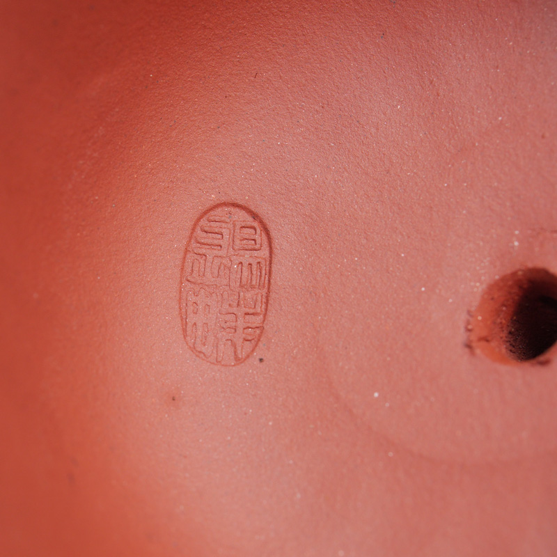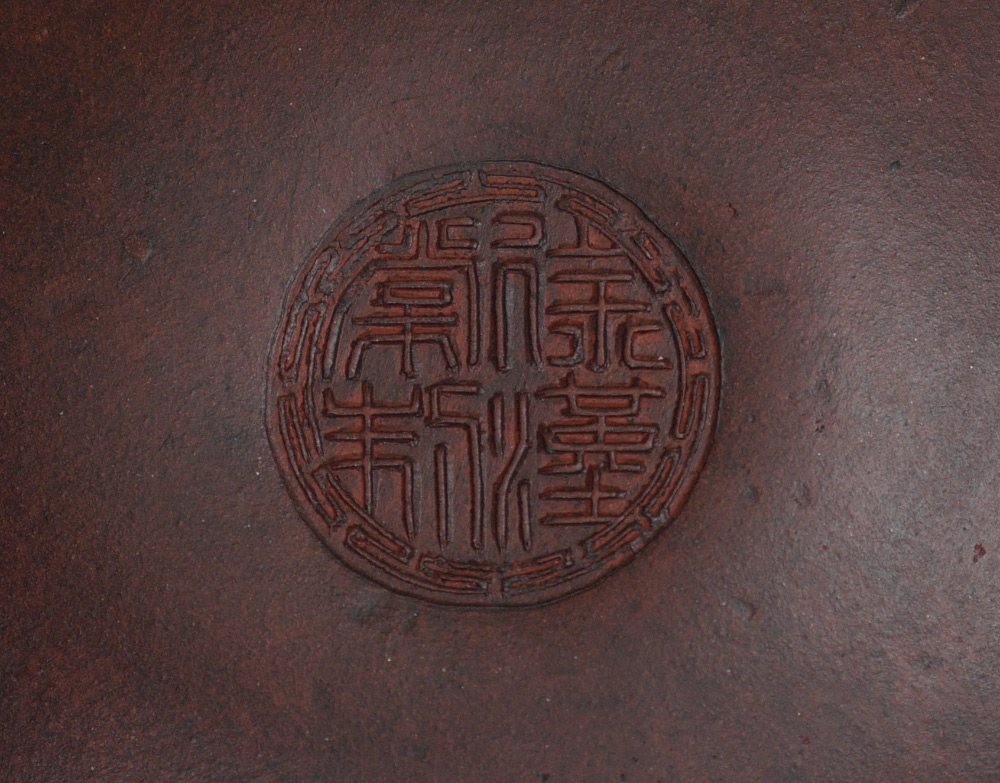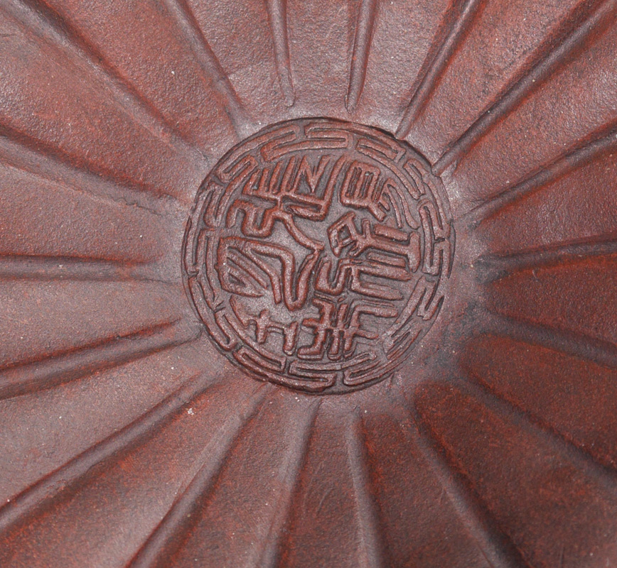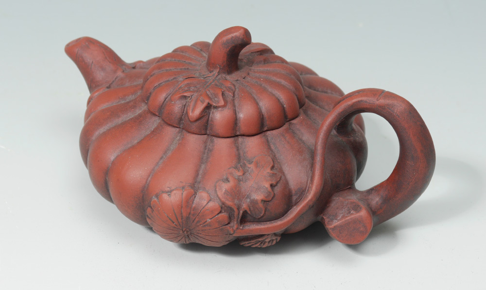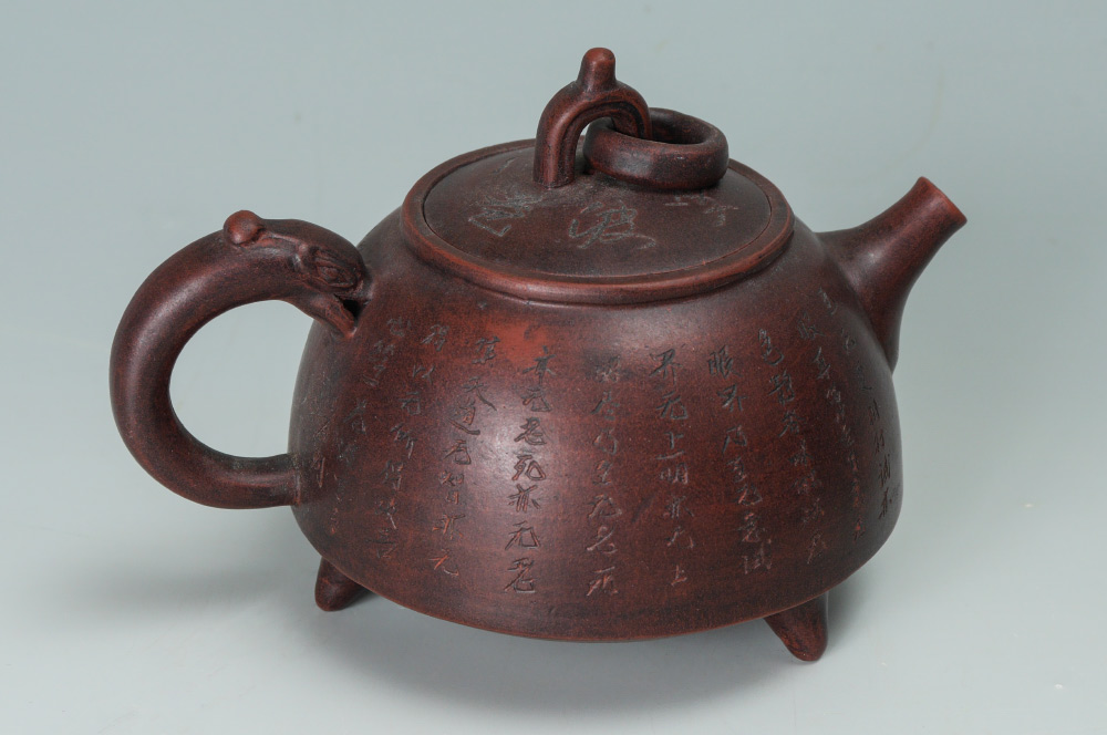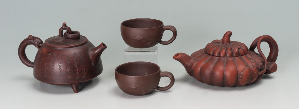 4 PIECE CHINESE YIXING POTTERY: 4 pieces total to include 1) Teapot with figural handle, lid with ring finial, inscribed on sides with calligraphy verses. Overall measures 4'' h. x 5 3/4''. 2) Squat gourd form teapot with lid, 3'' x 6 3/4''. 3-4) 2 tea cups with embossed leaf design 3 1/2'' dia.