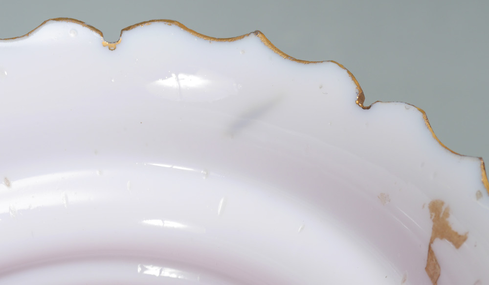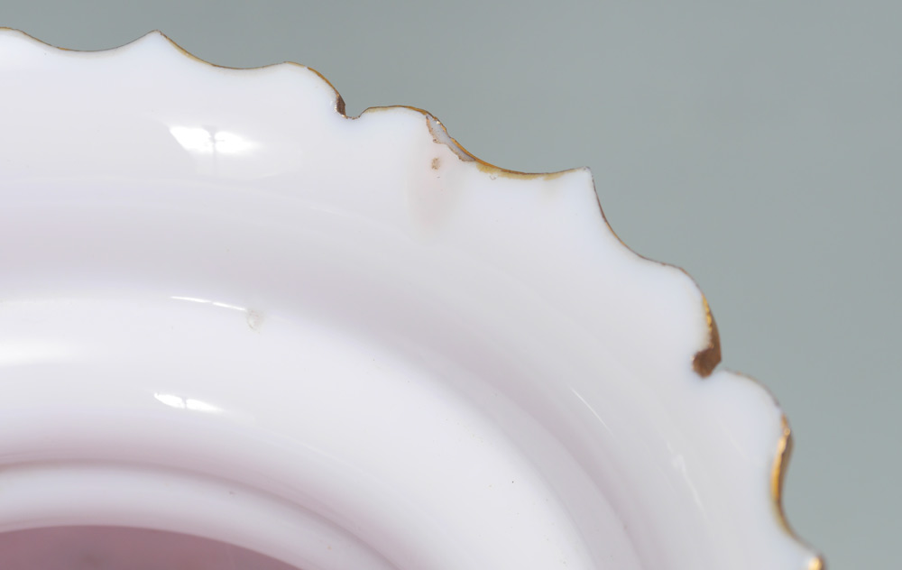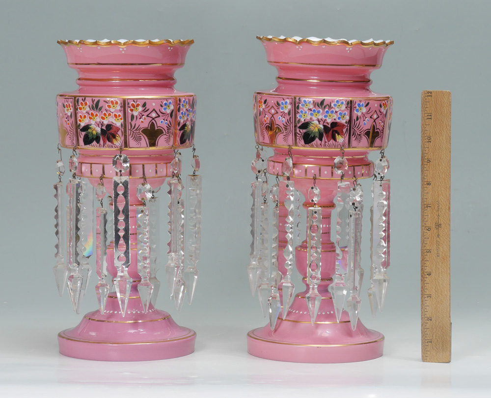 PAIR PINK GLASS LUSTERS / LUSTRES: Elaborate enamel decoration on cased pink glass mantle lustres with double row of crystal prisms. Measures 14 1/4'' h.