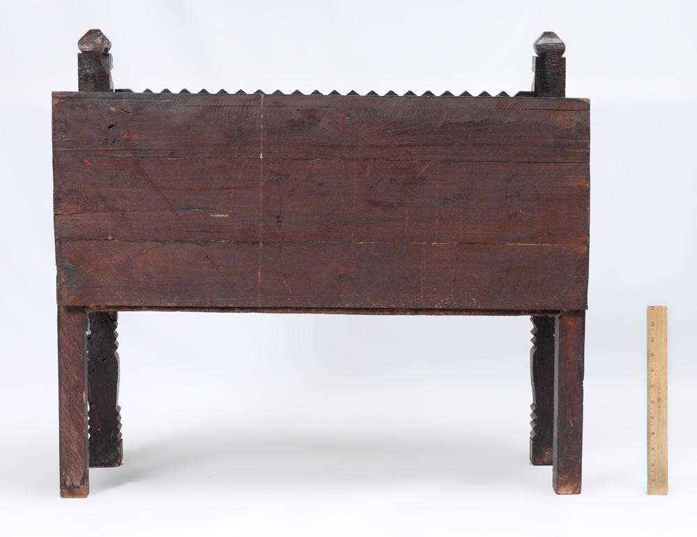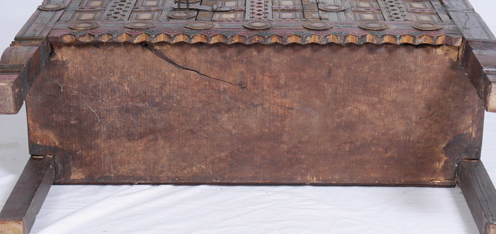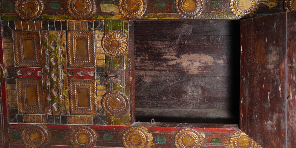 CARVED TIBETAN CHEST: Single door cabinet raised on legs, carved and decorated throughout except for straight back legs, cabinet is 15.5''h., overall 30.25'' x 33''w. x 12''d.